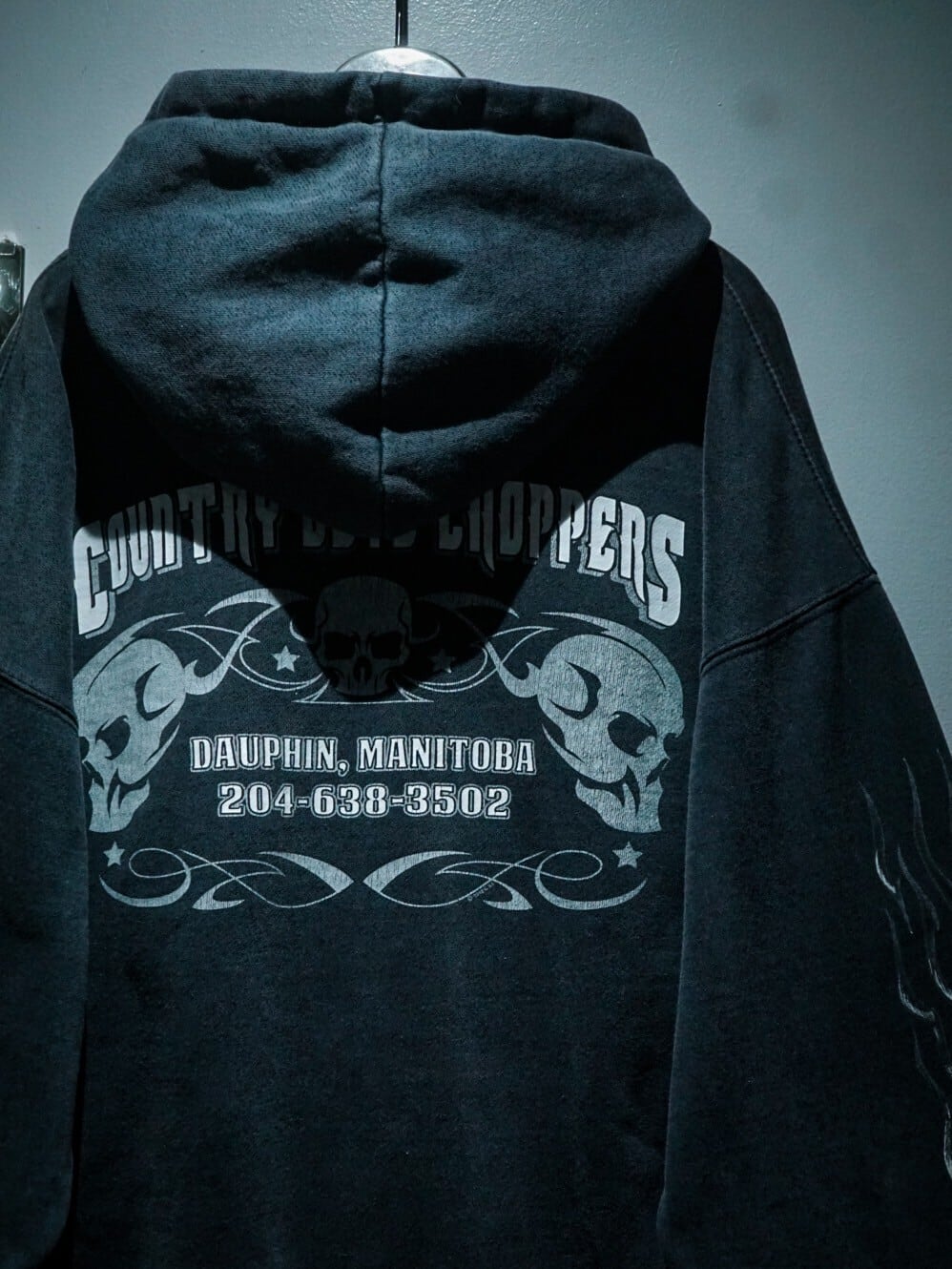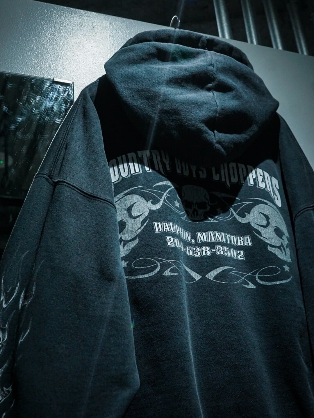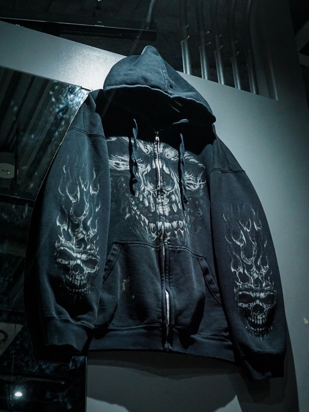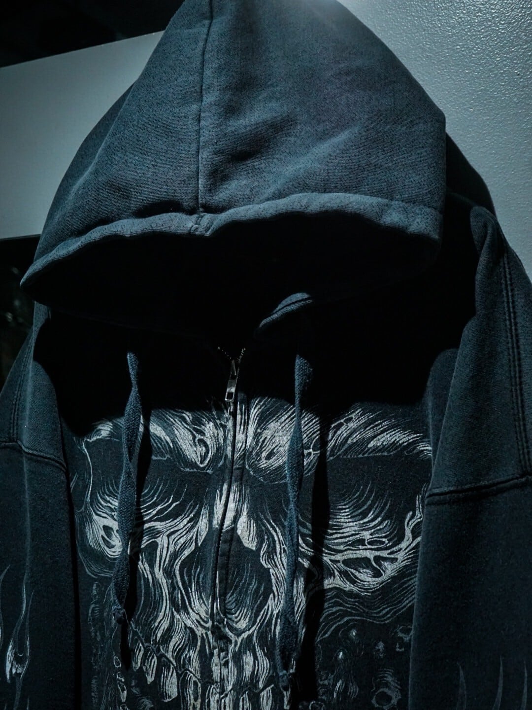 ブラックのスウェット地のボディに、ダークな雰囲気漂うスカルをプリントしたジップアップフーディ。迫力ありながら繊細に描かれたスカル、これめちゃくちゃイケてます、、、