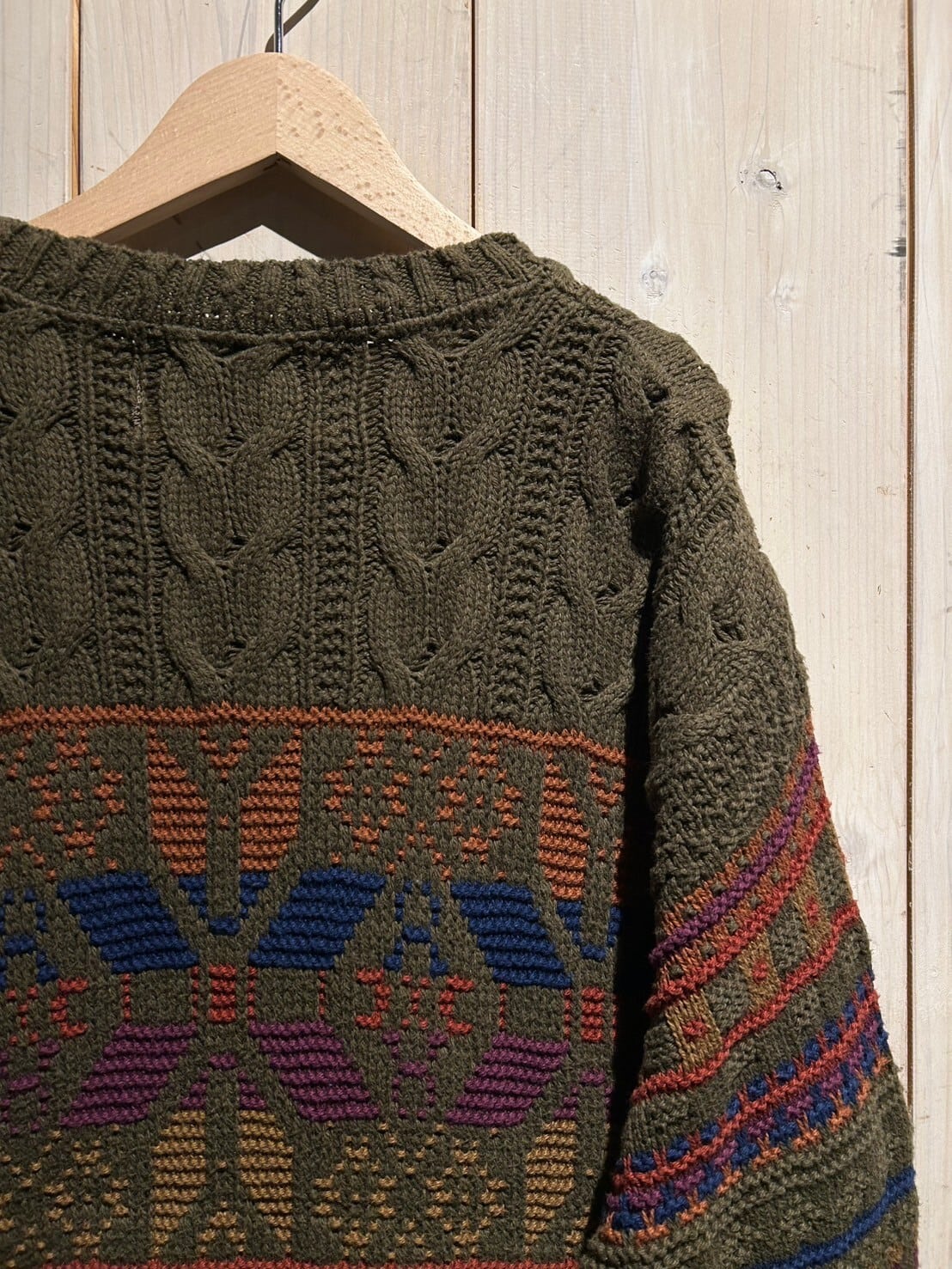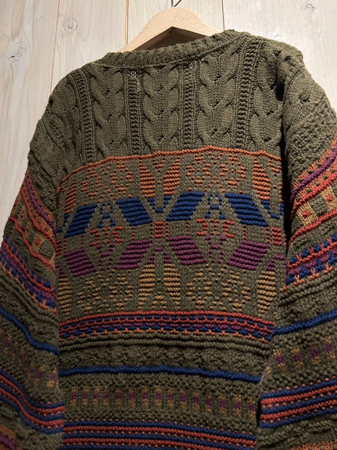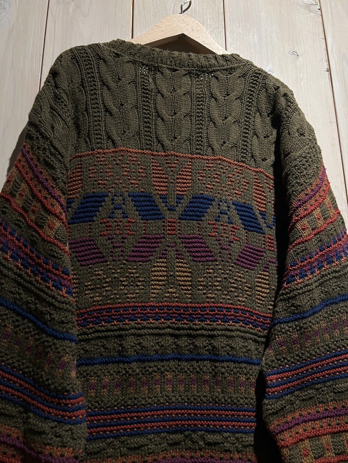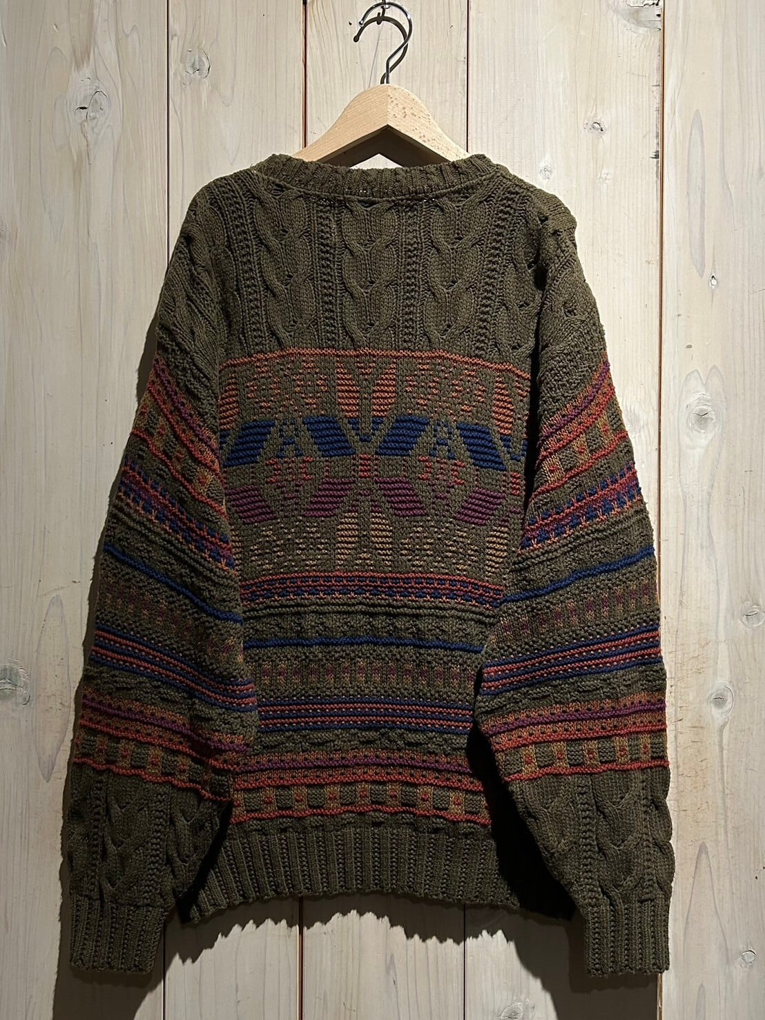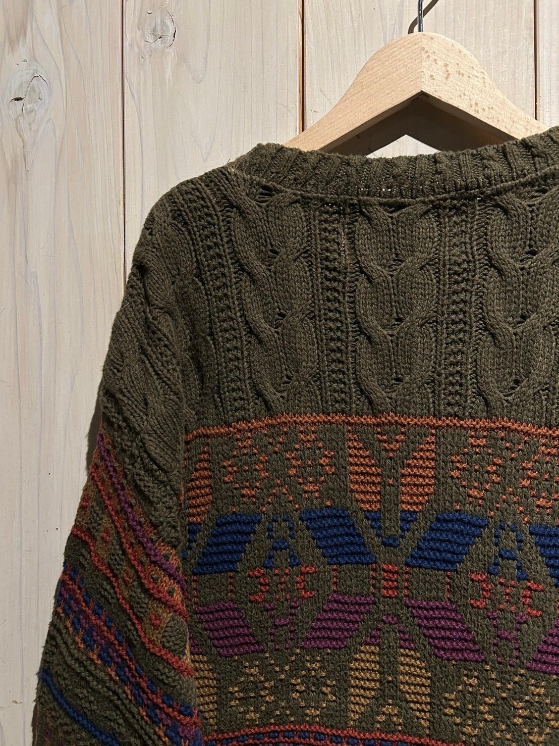 ブラウンカーキのケーブルニットをベースにネイティブ調の柄を編み込んだプルオーバーニット。