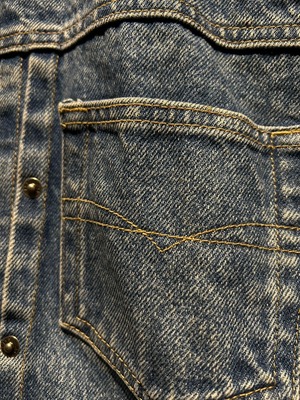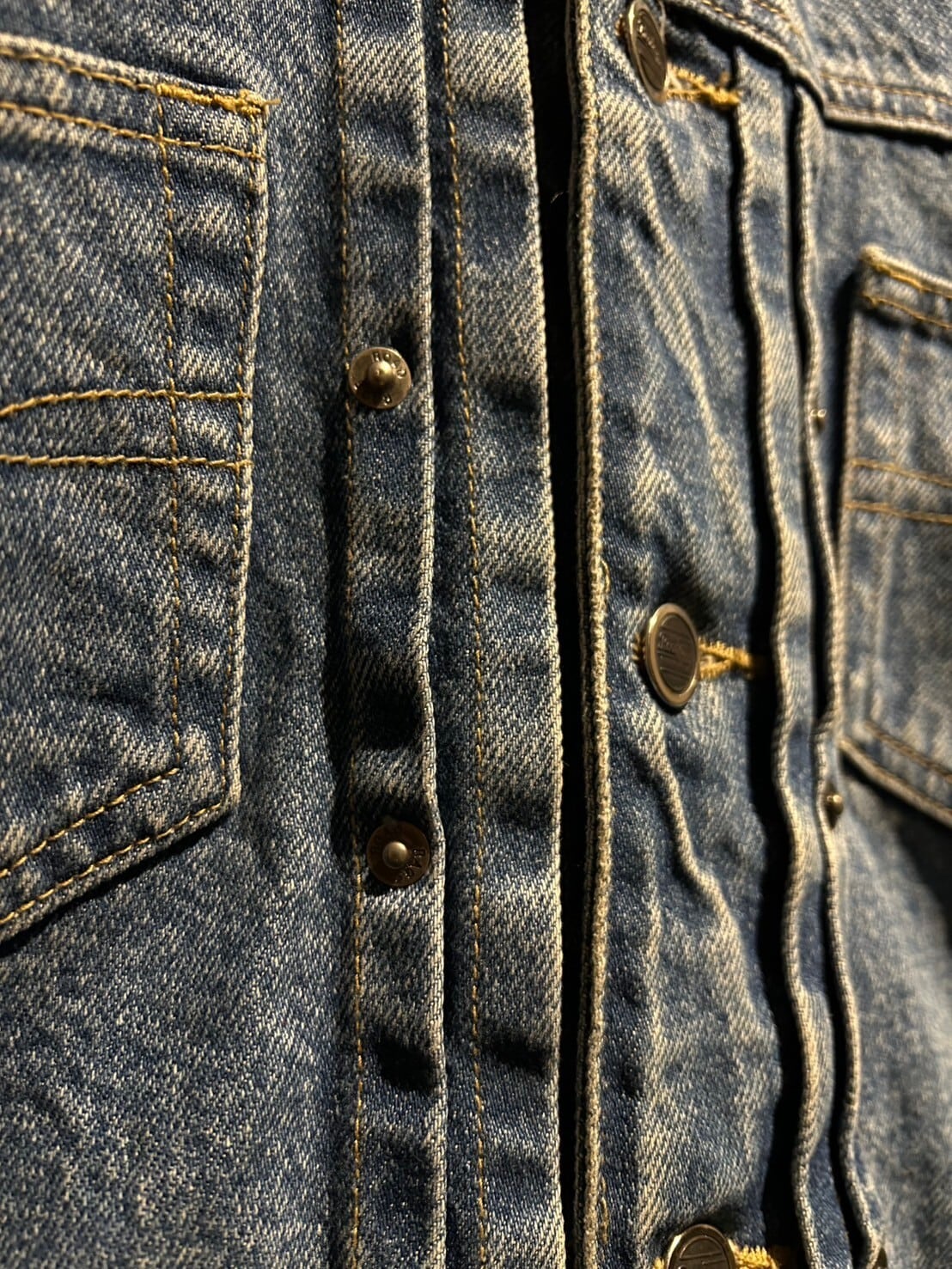フロント両胸にはデニムパンツのバックポケットを施し、両サイドにはスラッシュポケット、中央付近にはリベットを打ち込んだデザイン。細部のデザイン性の非常に高い1着に仕上がっています。