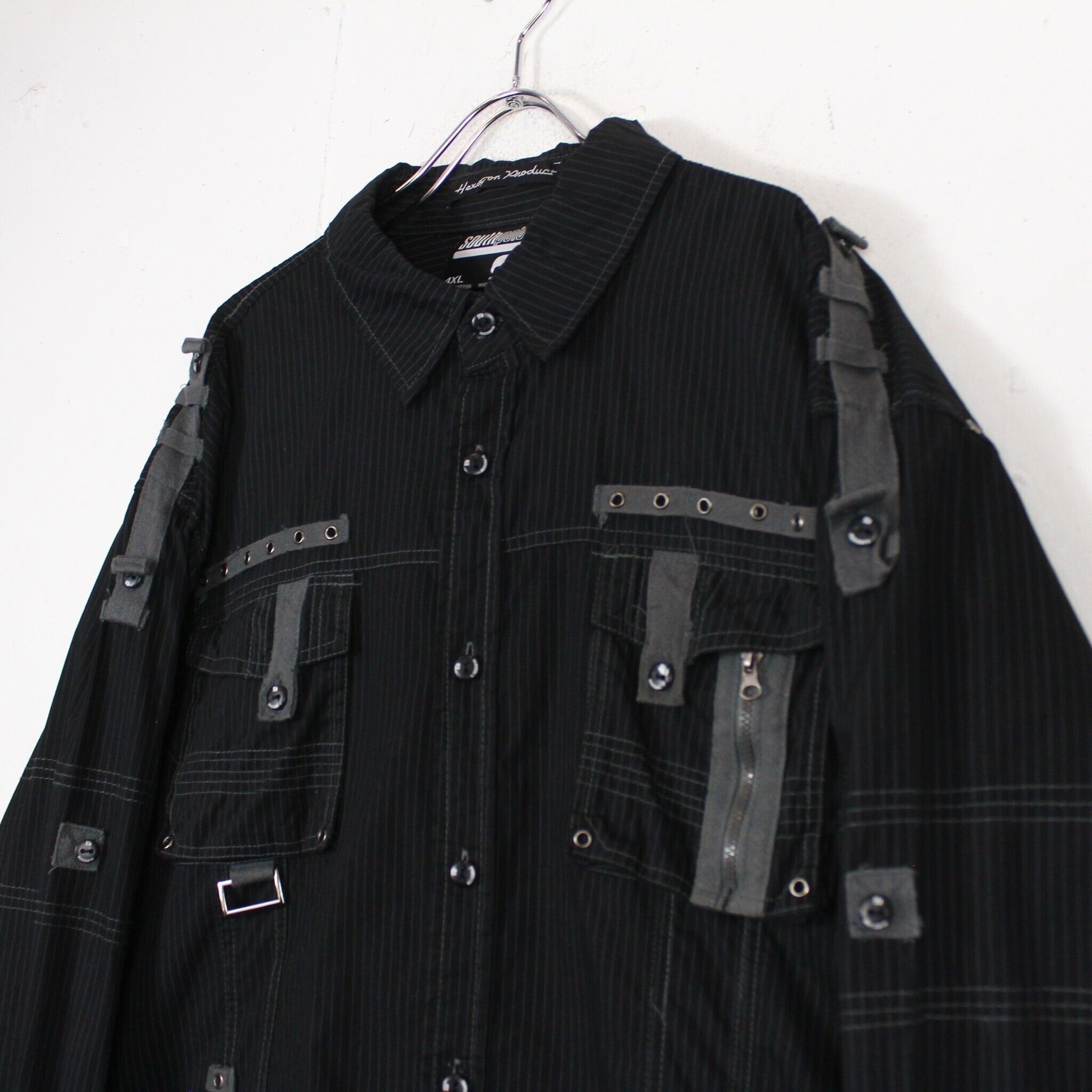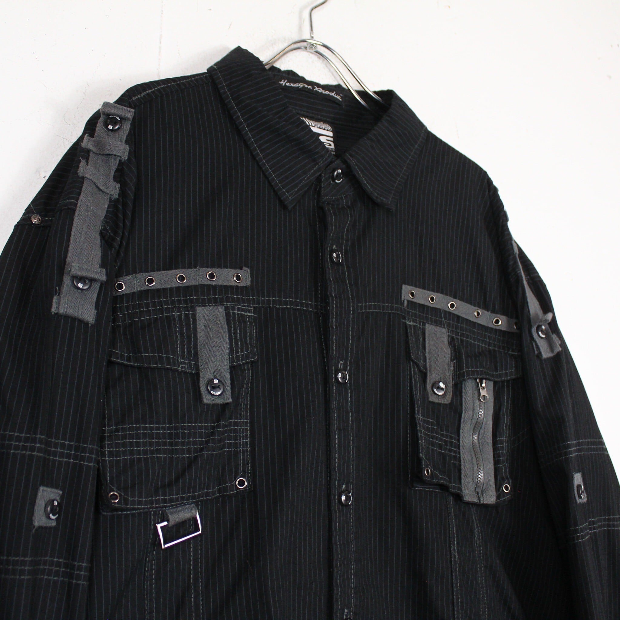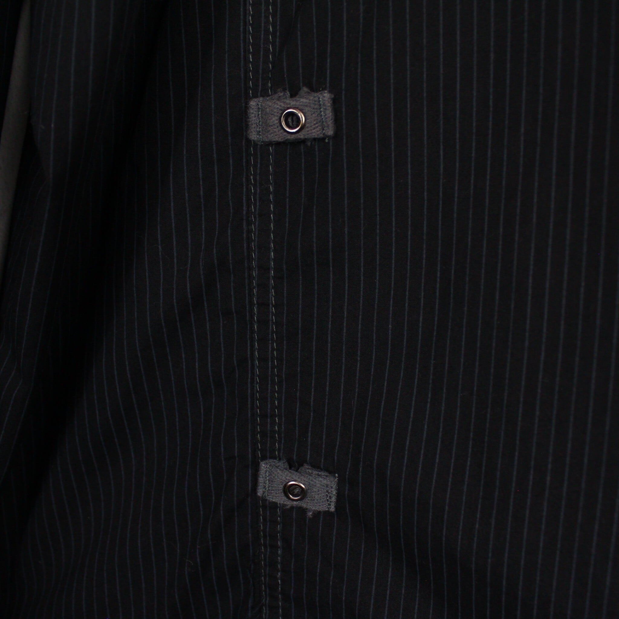 ストライプを載せたボディに、随所にアイレットをデザインとして落とし込んだシャツジャケット。