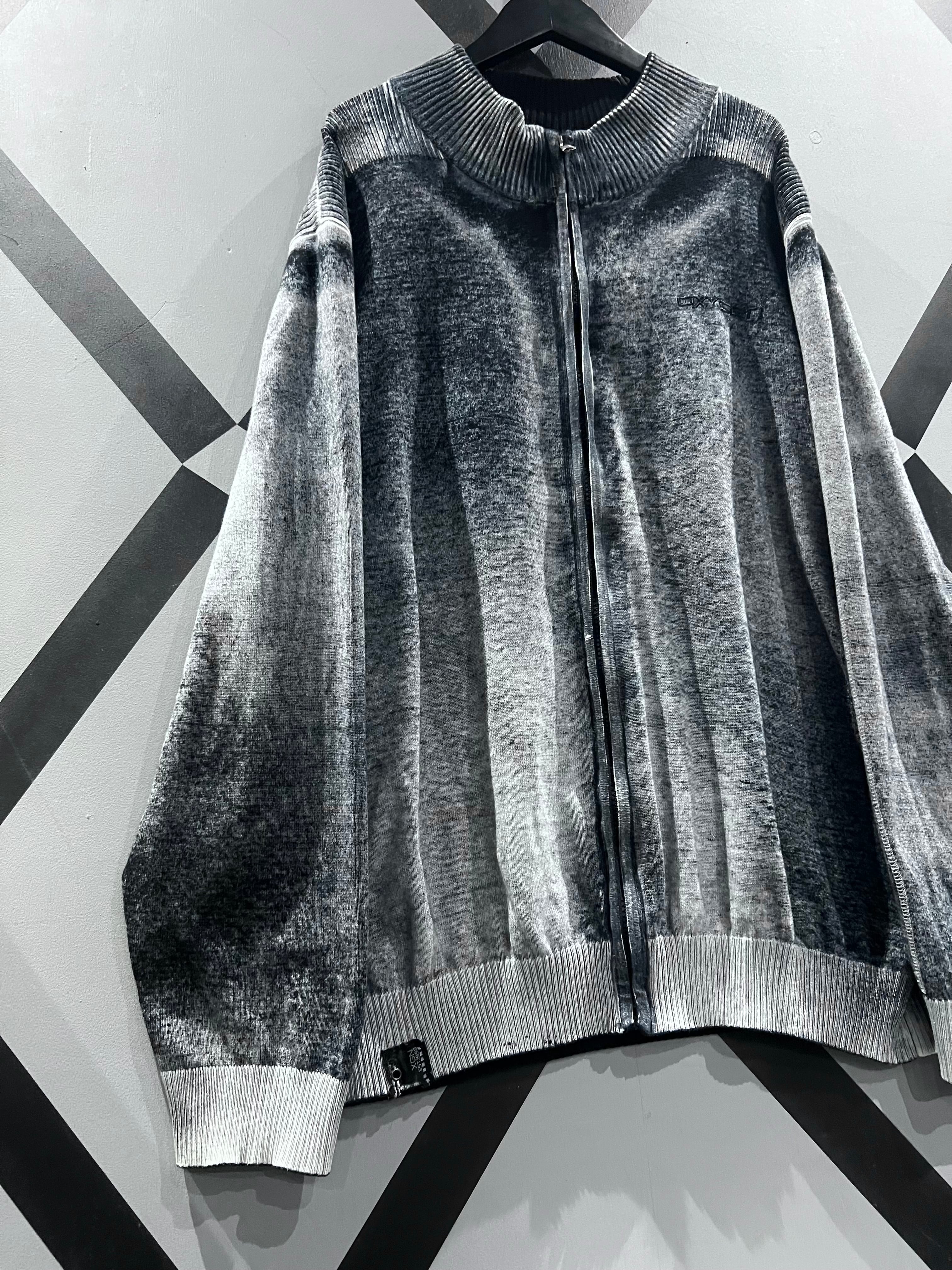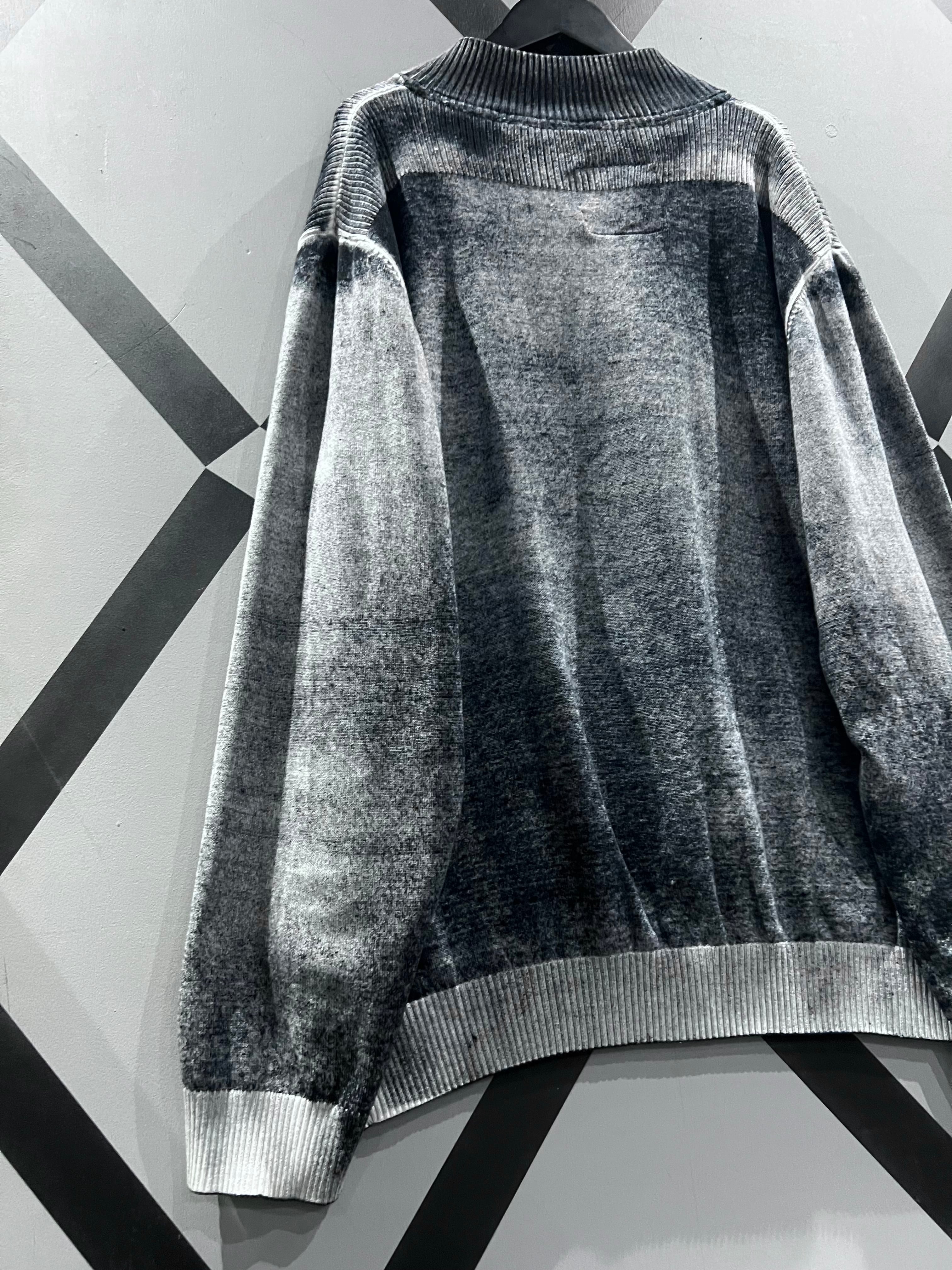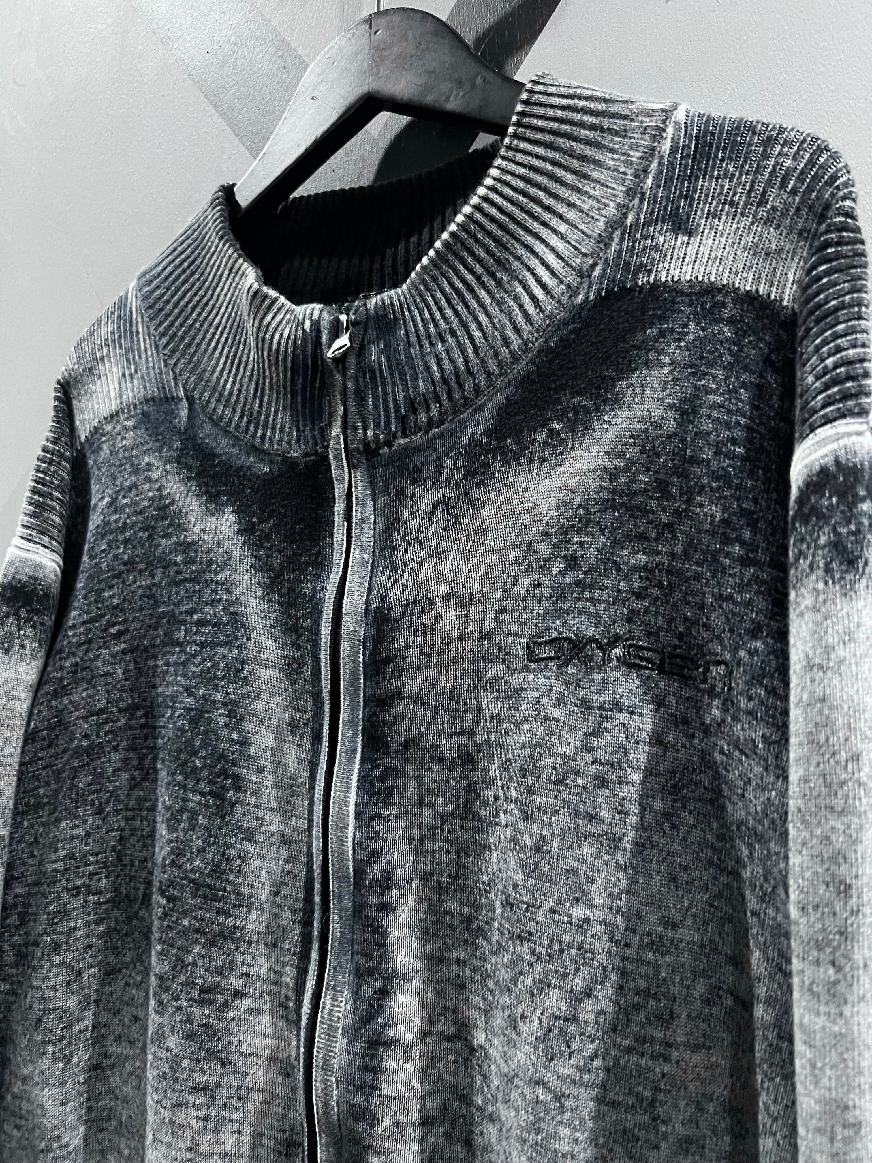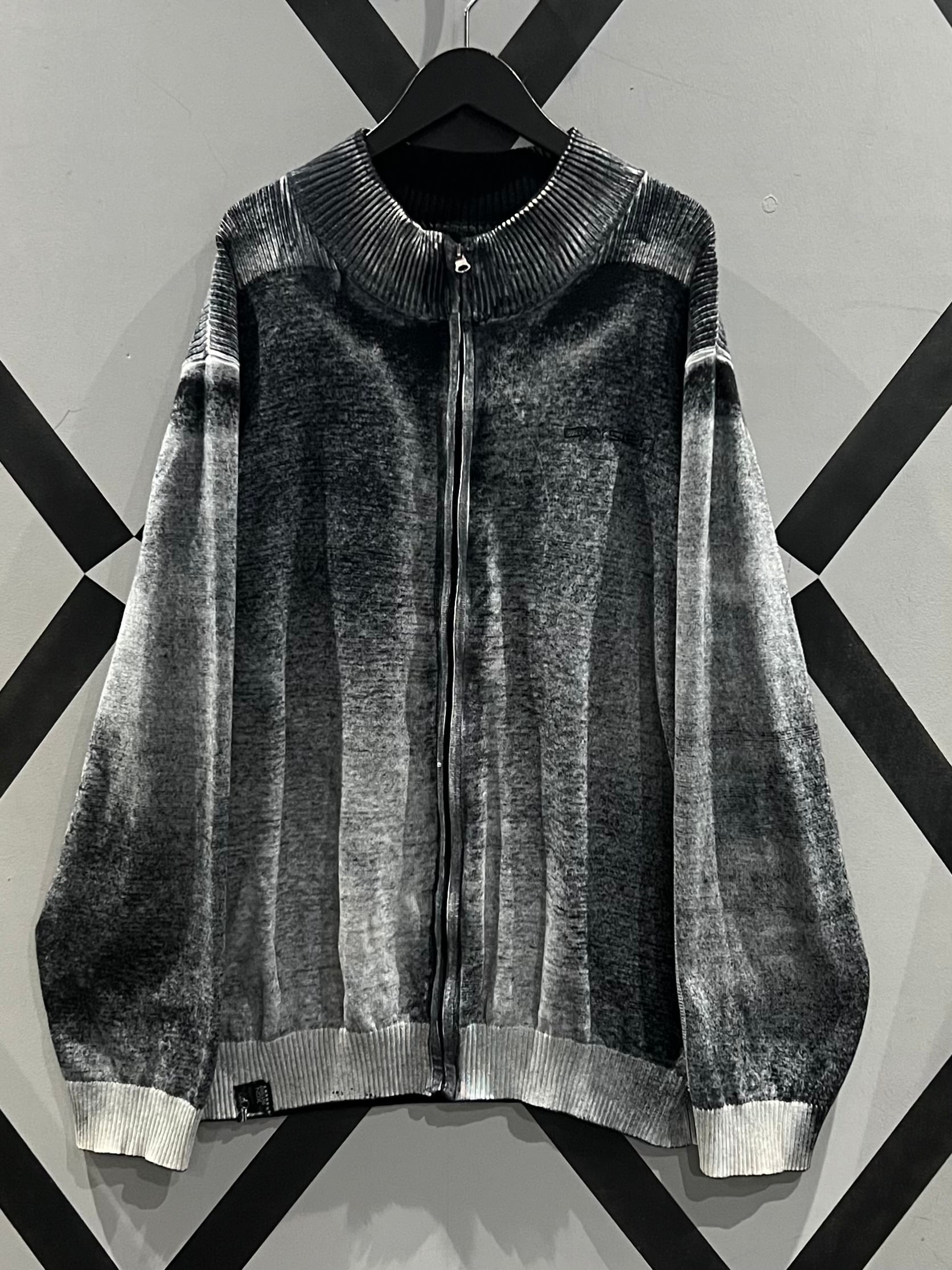 肉感のあるニットのボティに、モノトーンでフェード調のデザインを載せたジップアップニットジャケット。