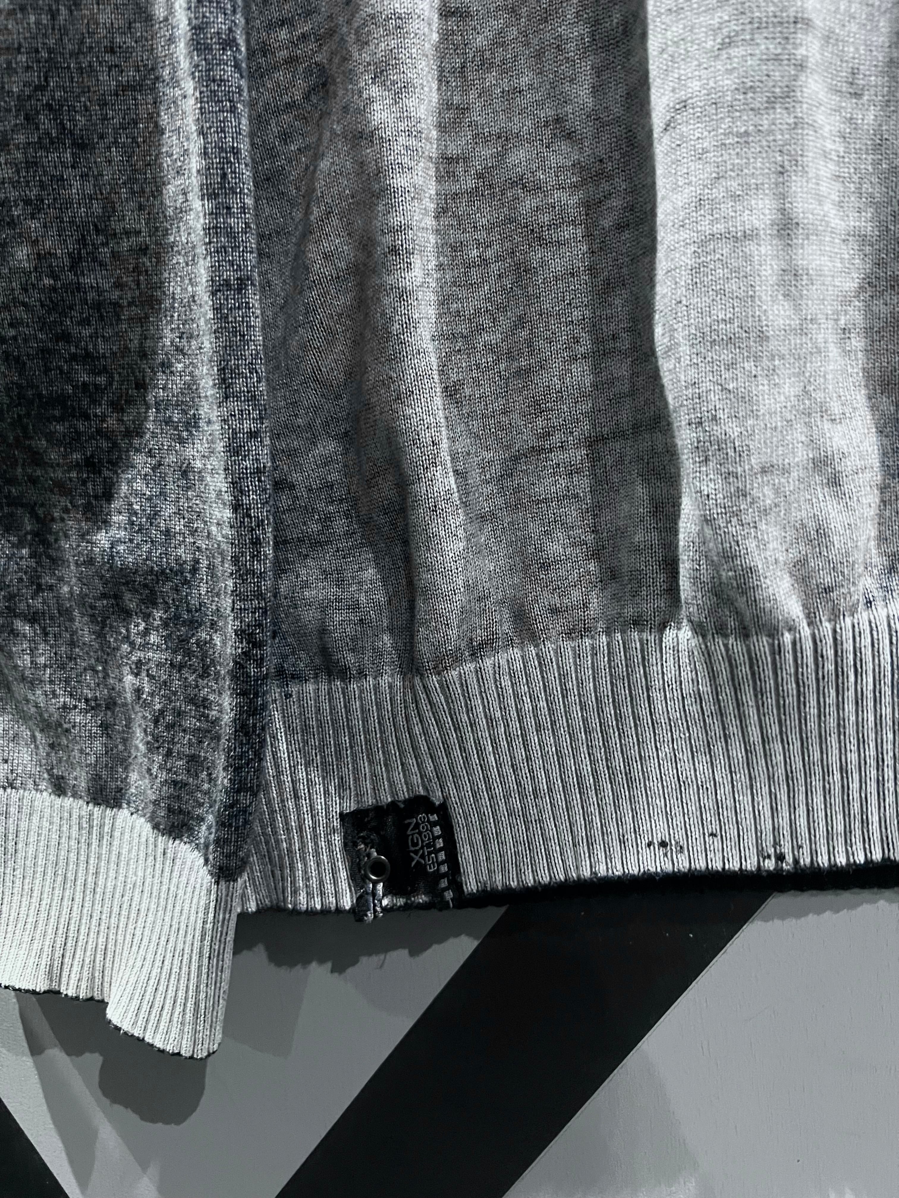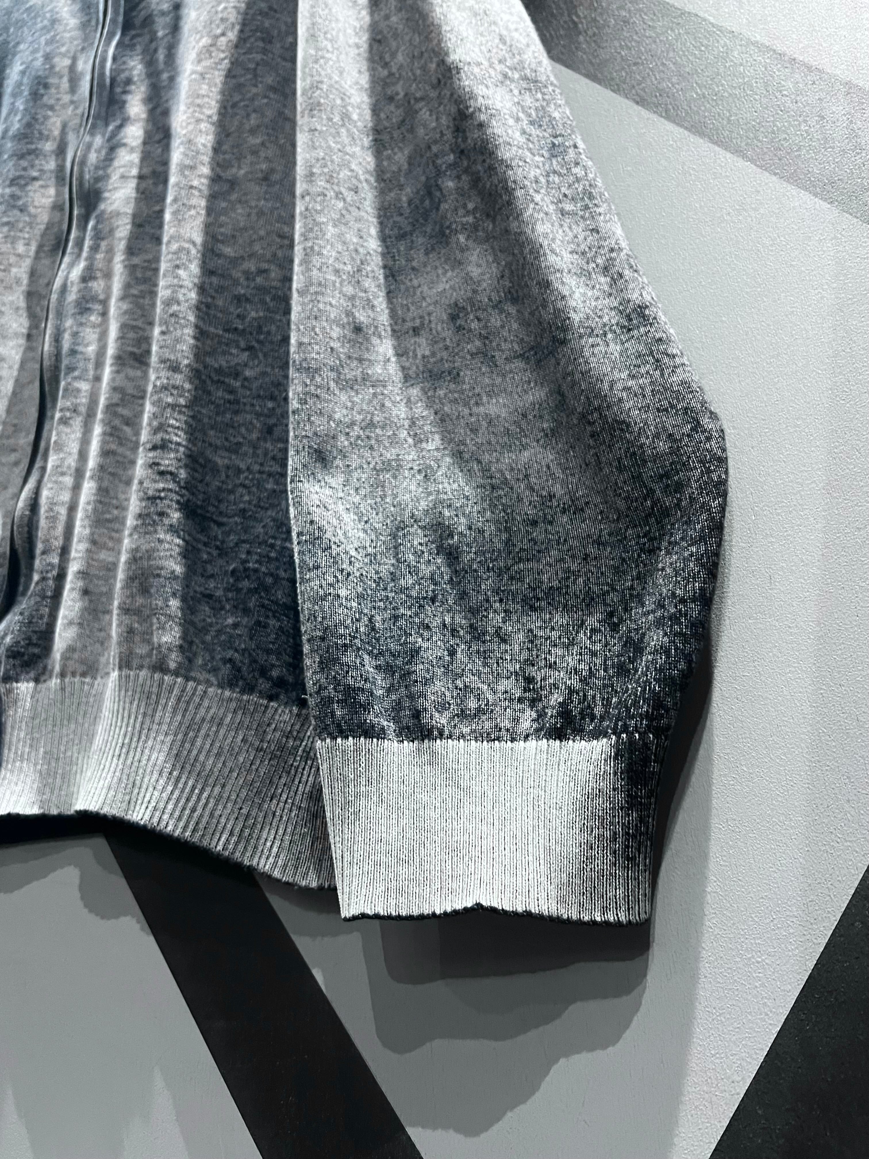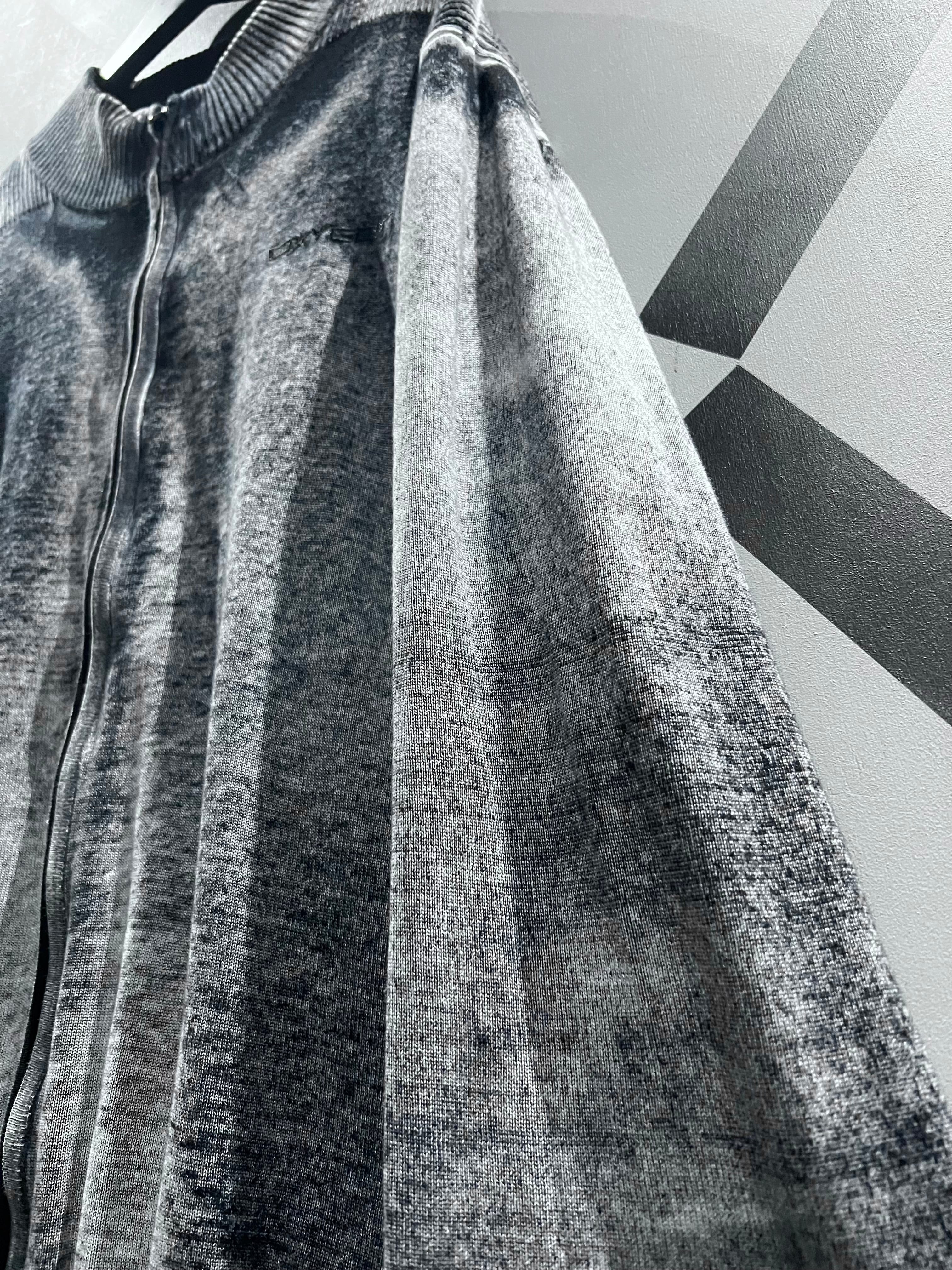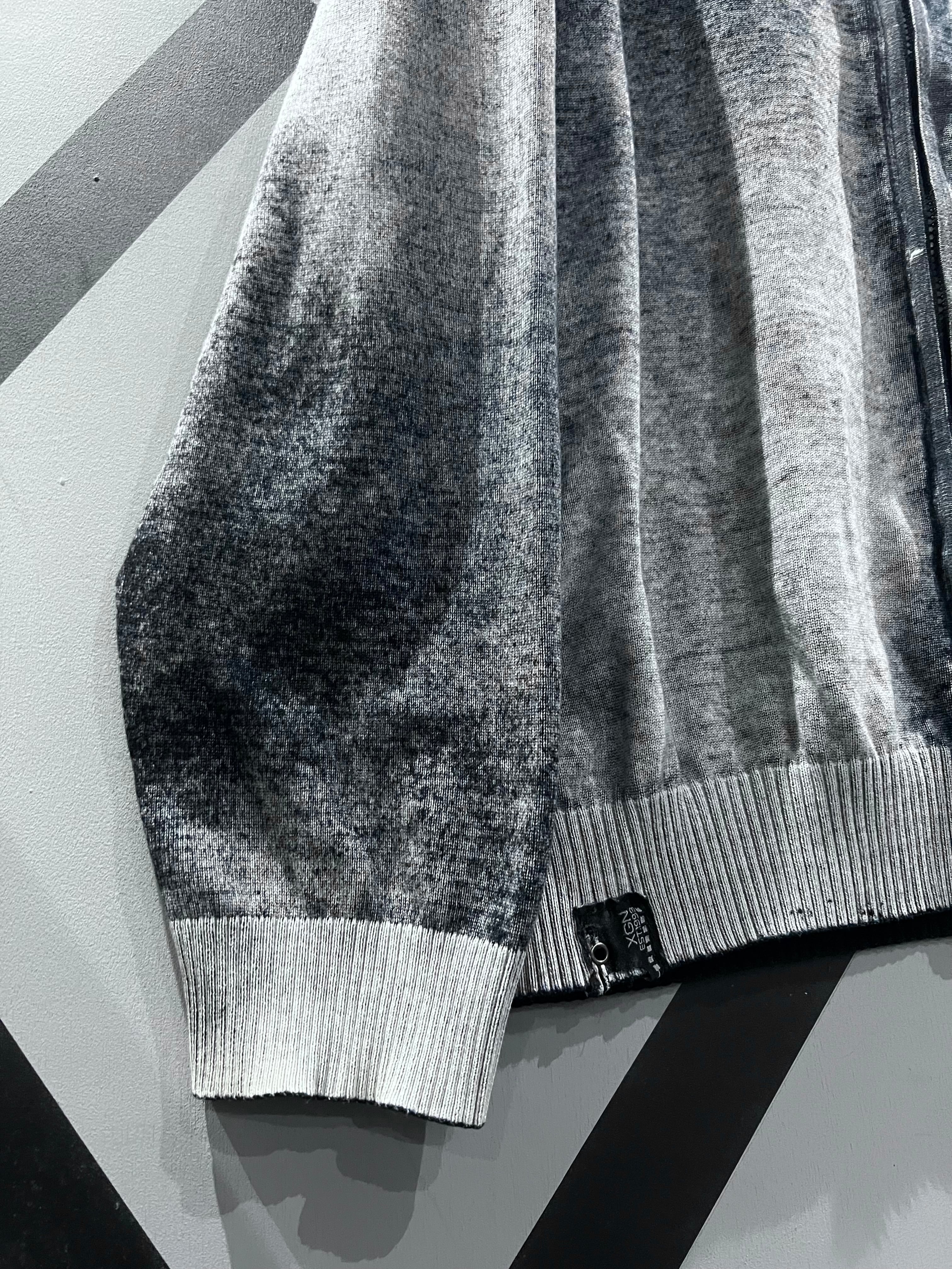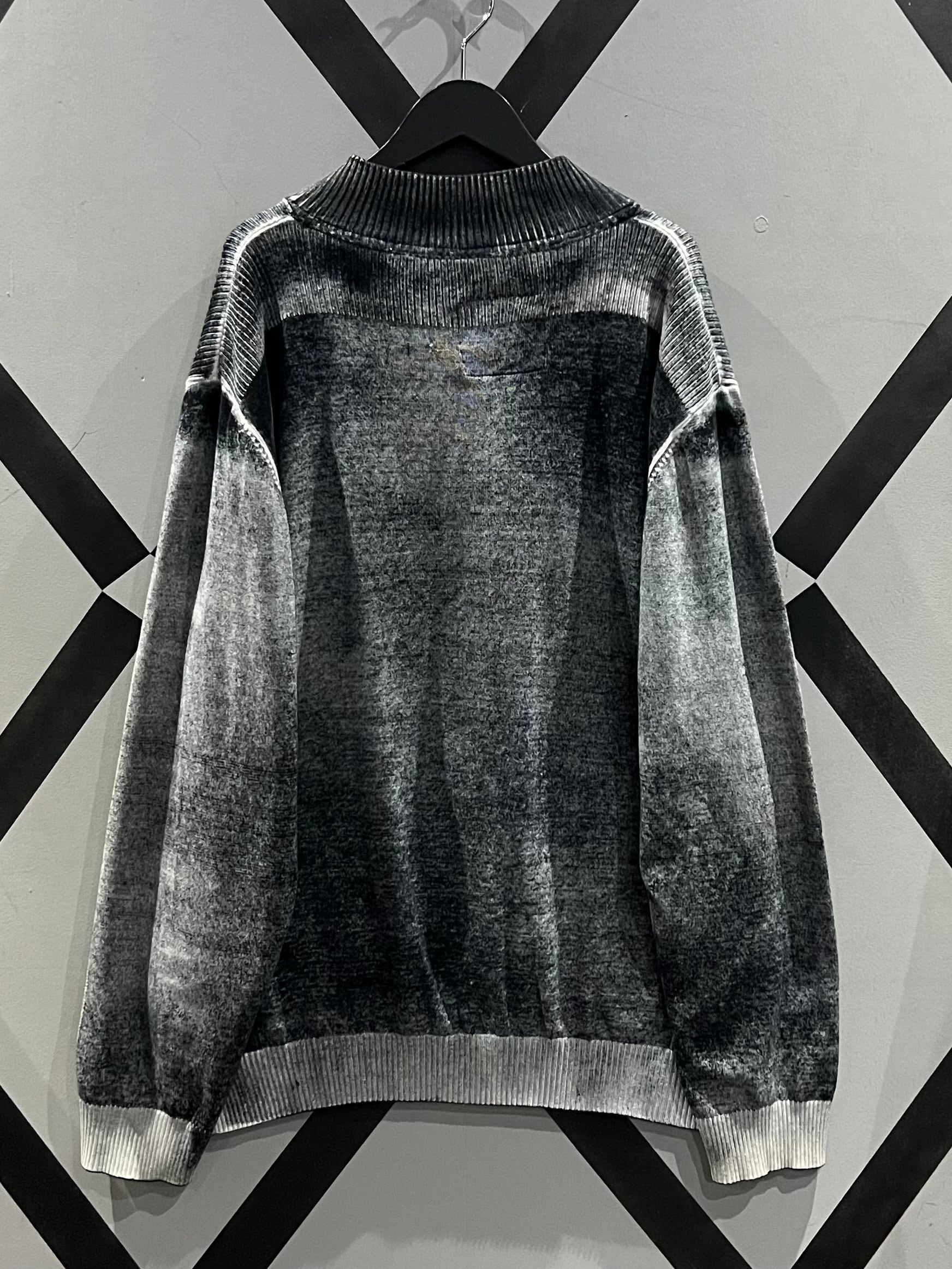肉感のあるニットのボティに、モノトーンでフェード調のデザインを載せたジップアップニットジャケット。