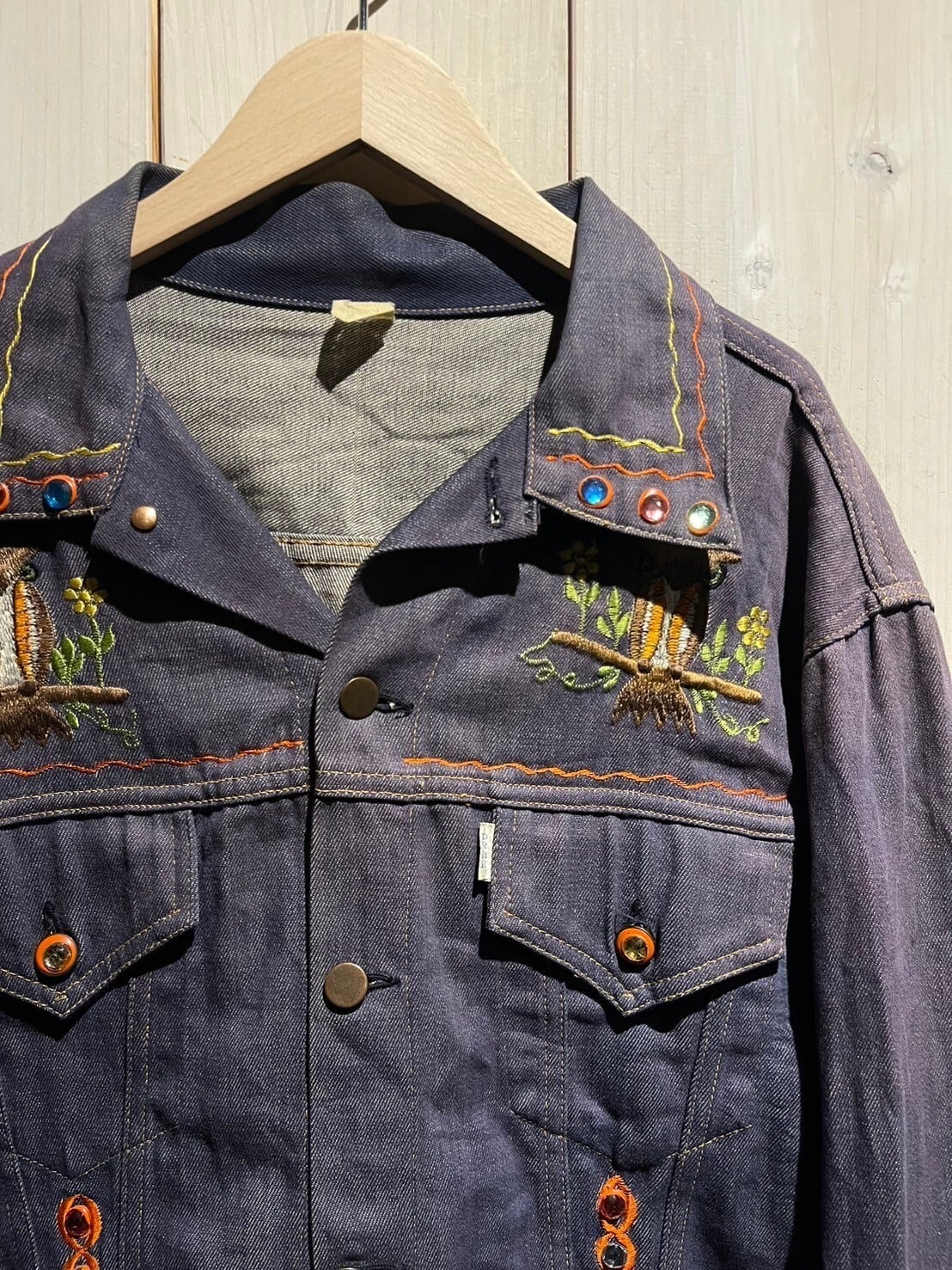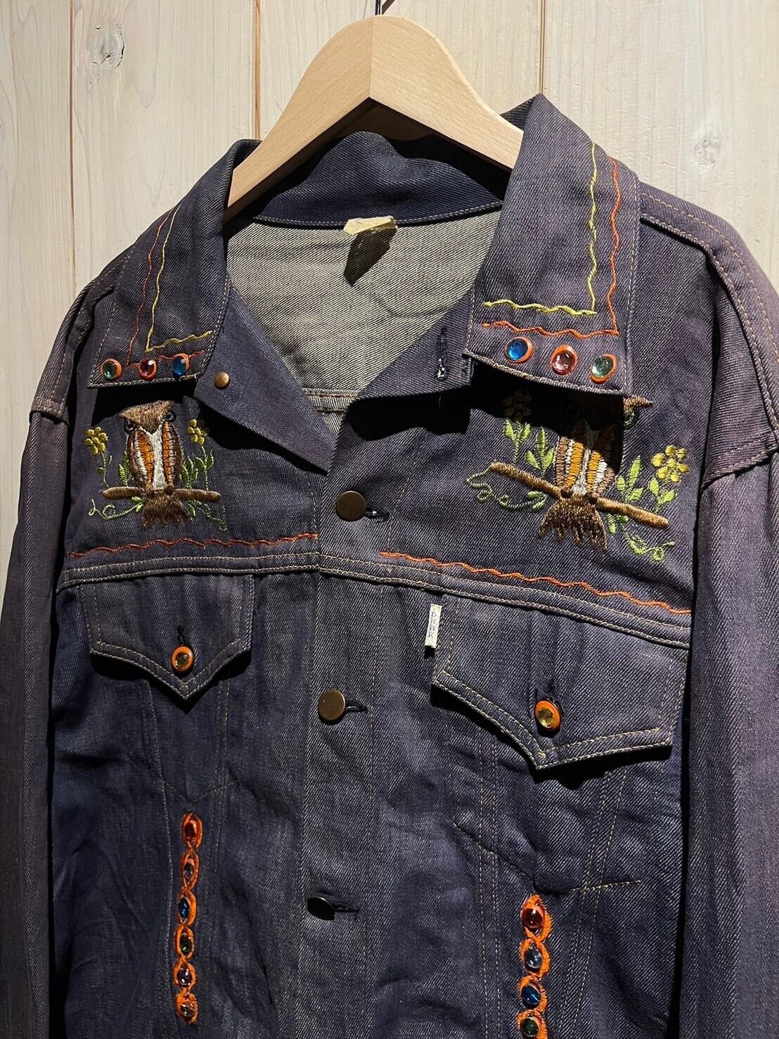 経年変化によるフェードが非常に美しいトラッカージャケットに、刺繍や装飾が施された1着。