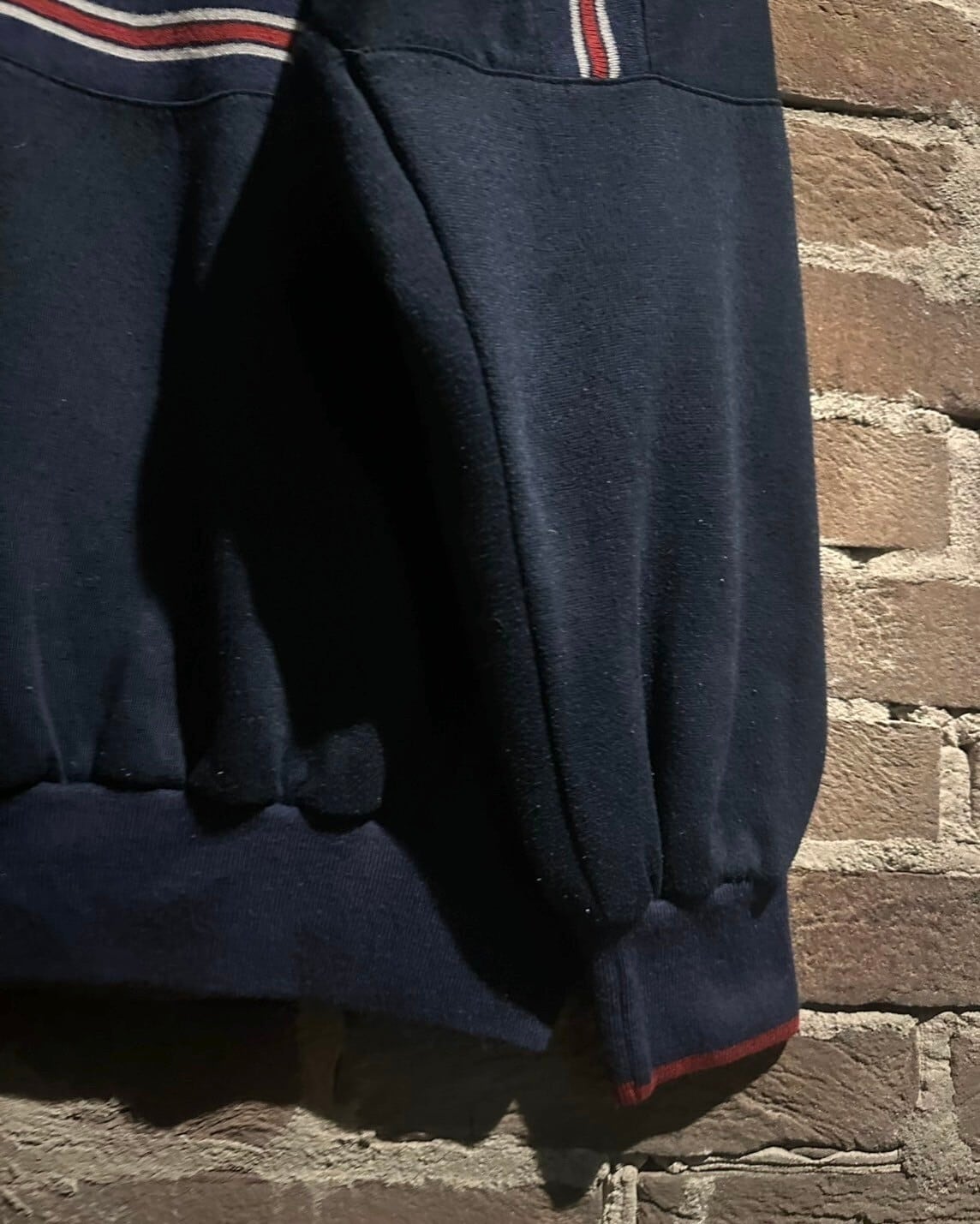 ネイビーのボディに、赤×白のトリコロールカラーで仕上げた、ラグジュアリーかつレトロな雰囲気漂うスウェット。