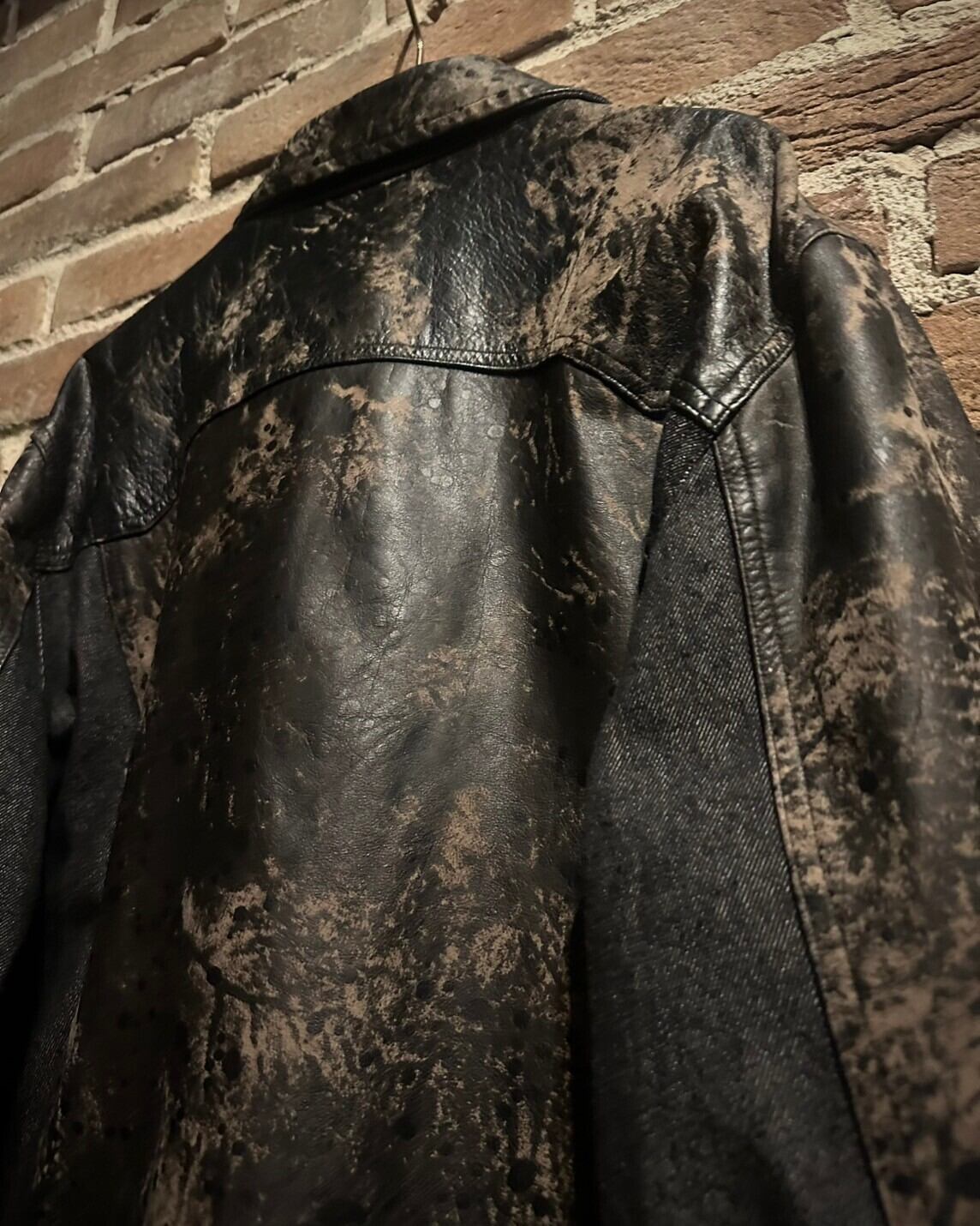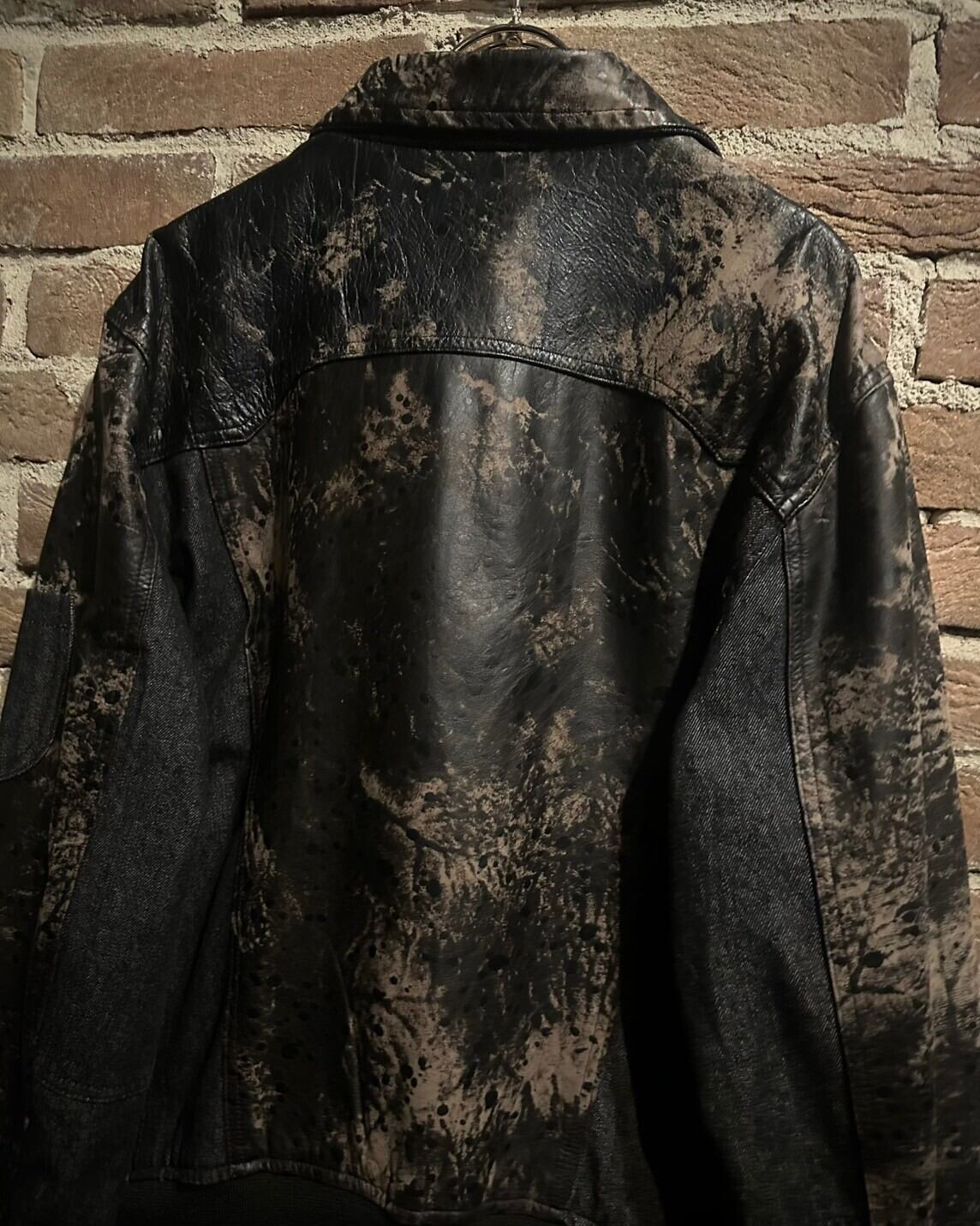 ヴィンテージ市場において稀少価値が高まっているブラックデニムをベースに、ブリーチしたようなデザインをのせた、フェード感がイケてるレザーを切り替えたジップアップジャケット。