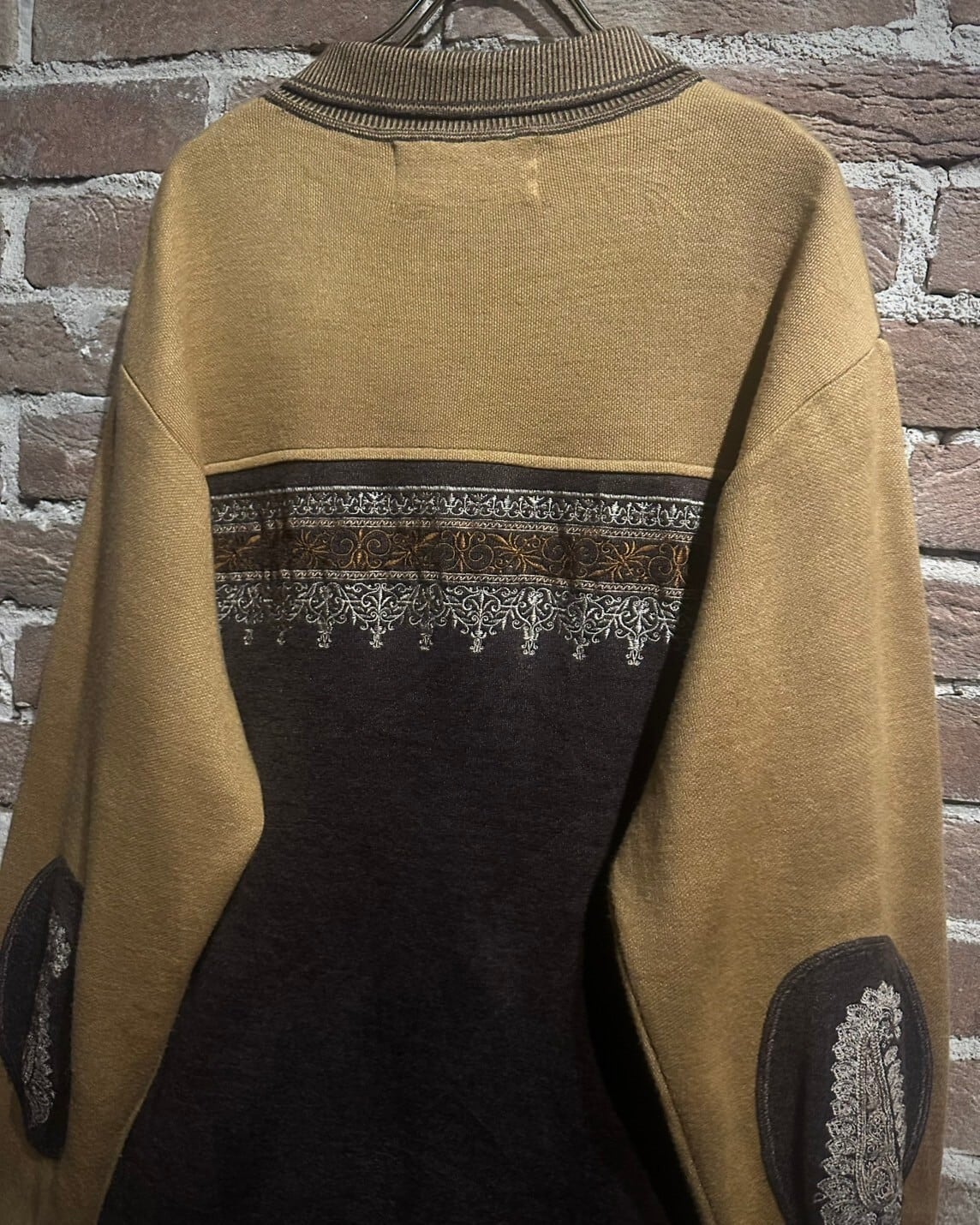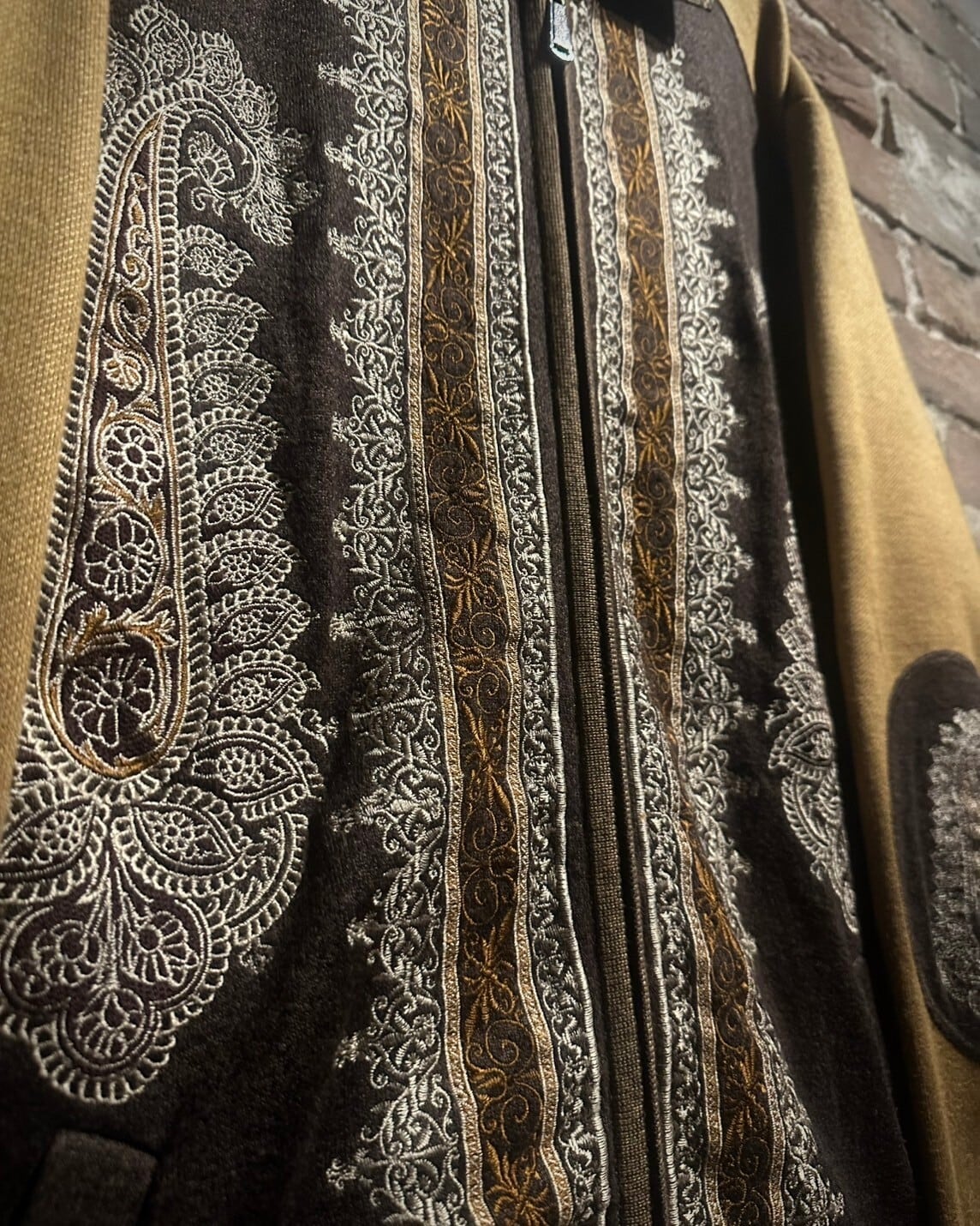 アクリルとレーヨンを混紡した滑らかなニットのボディに、緻密で繊細なボタニカル柄とペイズリー柄の刺繍を施した、非常〜に美しいジップアップニットジャケット。