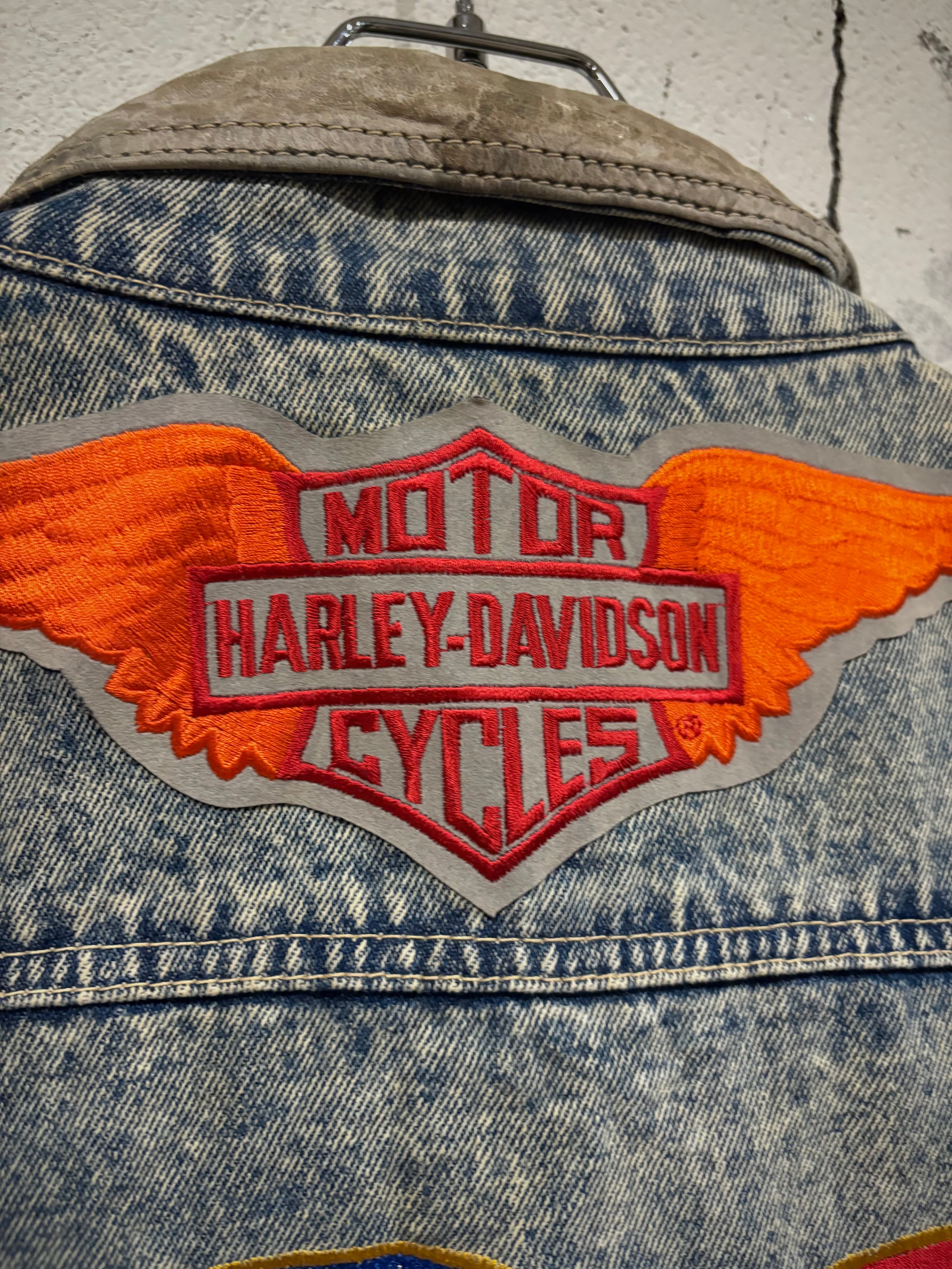 ボディにはヴィンテージでも高い人気を誇る"HARLEY DAVIDSON"のワッペンをON。さらに背面には"NIKE"の文字を載せた星条旗の刺繍など、前所有者のカスタムが載せられており、切り替えたレザーのフェード感と相まって古着ならではの醍醐味がギュッと詰め込まれた1着に。