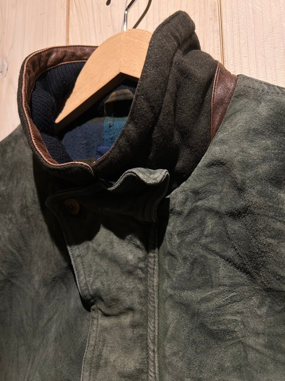 肘にはスムースレザーのエポレット、フロント両サイドに配されたA-2フライトジャケットを彷彿とさせる大判なフラップポケットと、一見シンプルなディテールですが、異素材を掛け合わせた事で他のアイテムとは一線を画する仕上がりに。