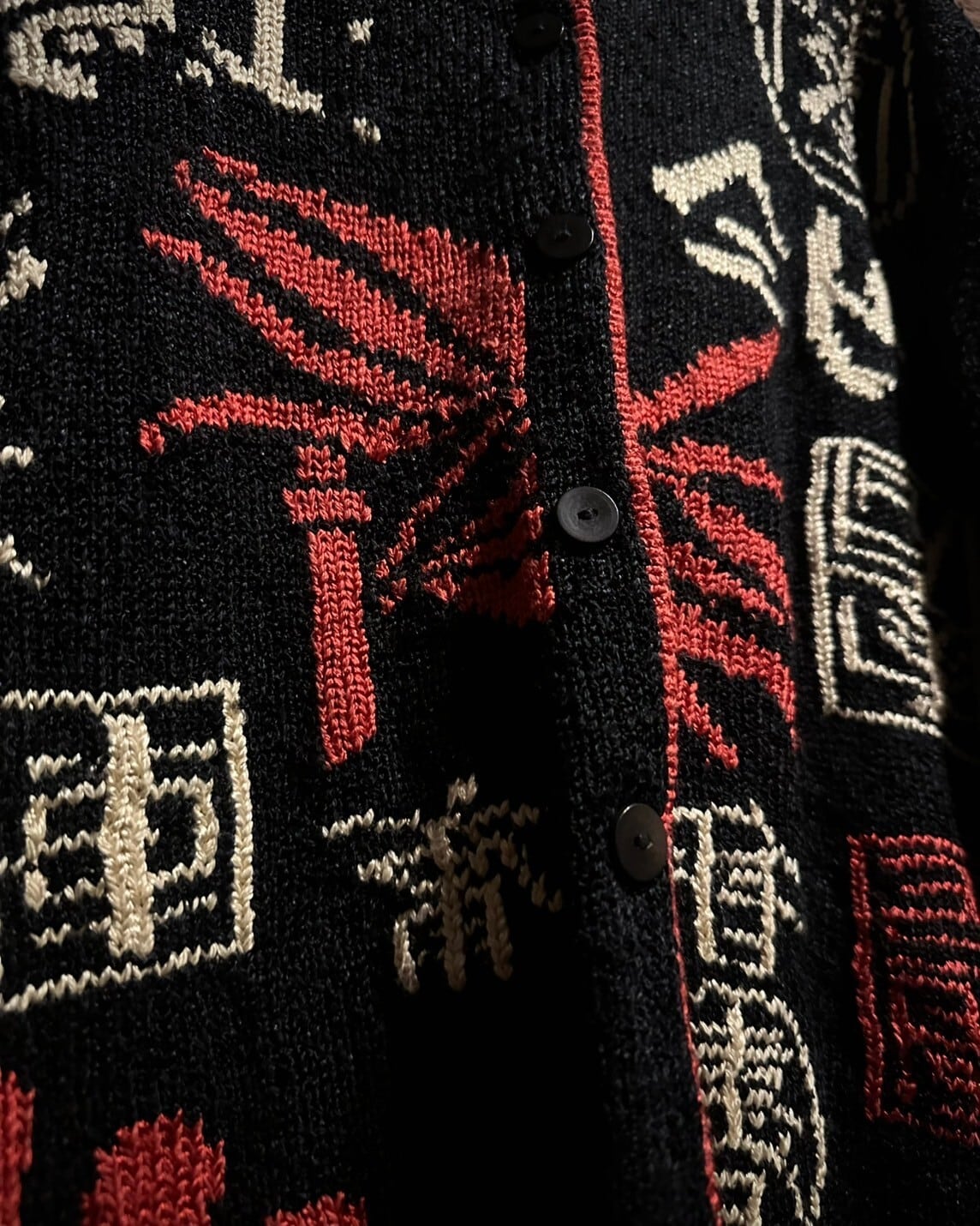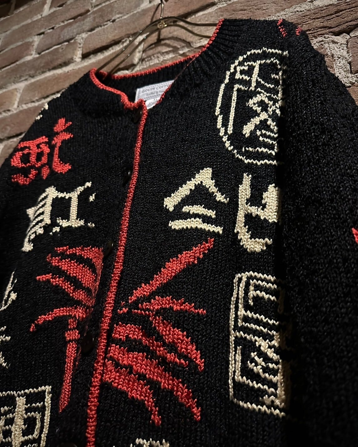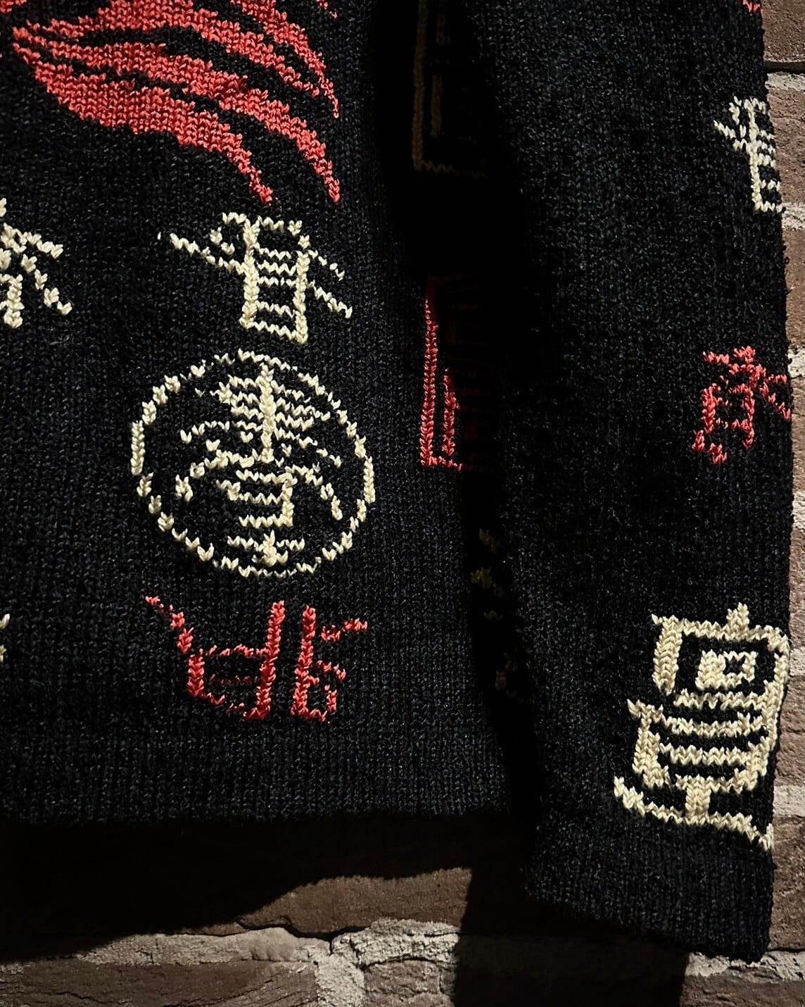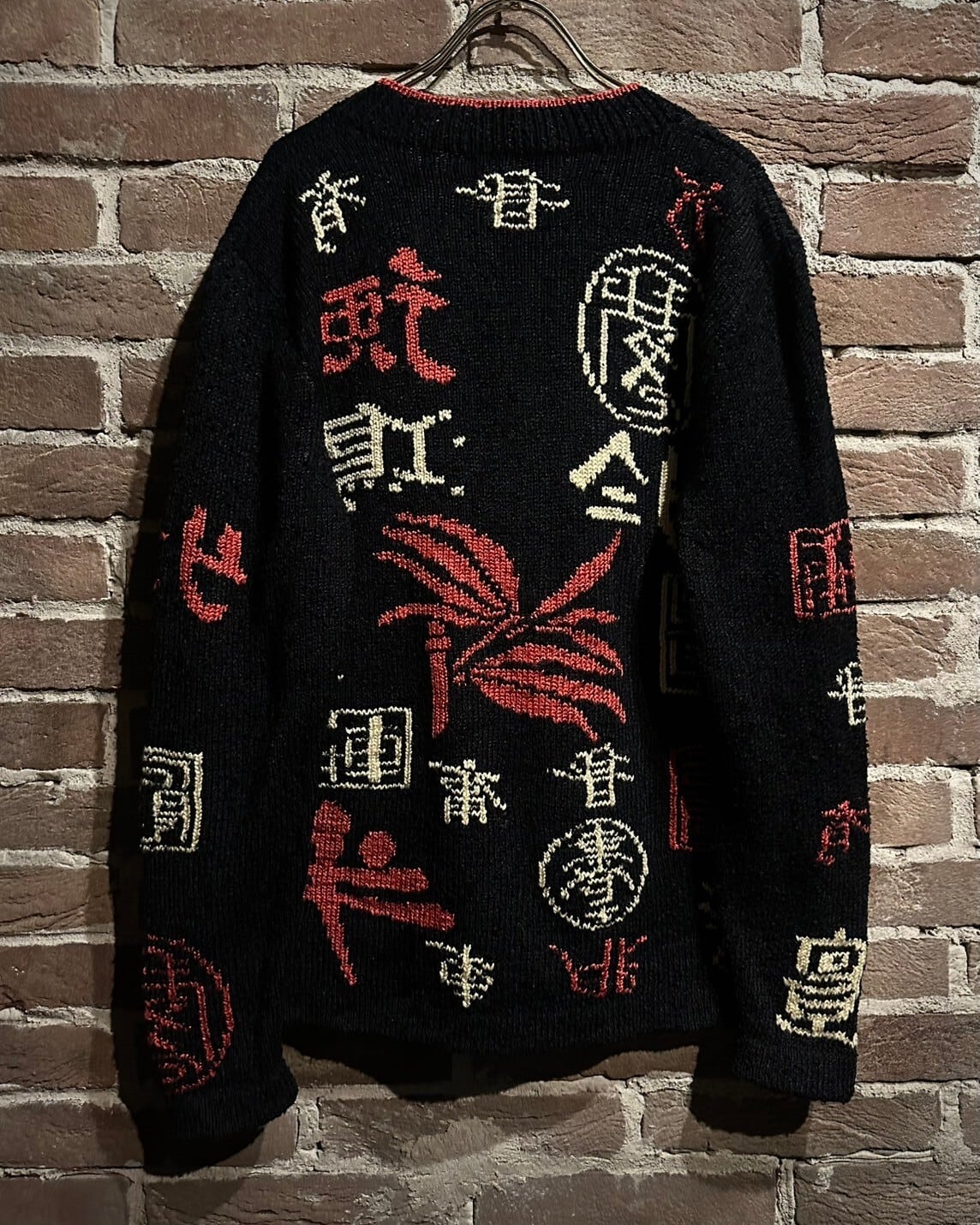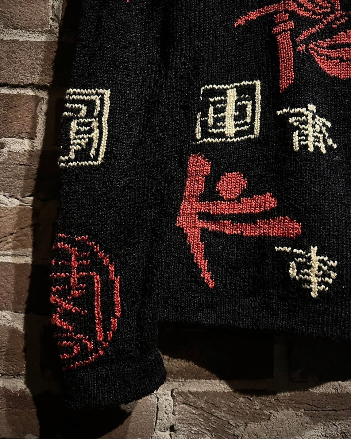 ブラックのボディをベースに漢字のデザインを載せた稀有なニットカーディガン。