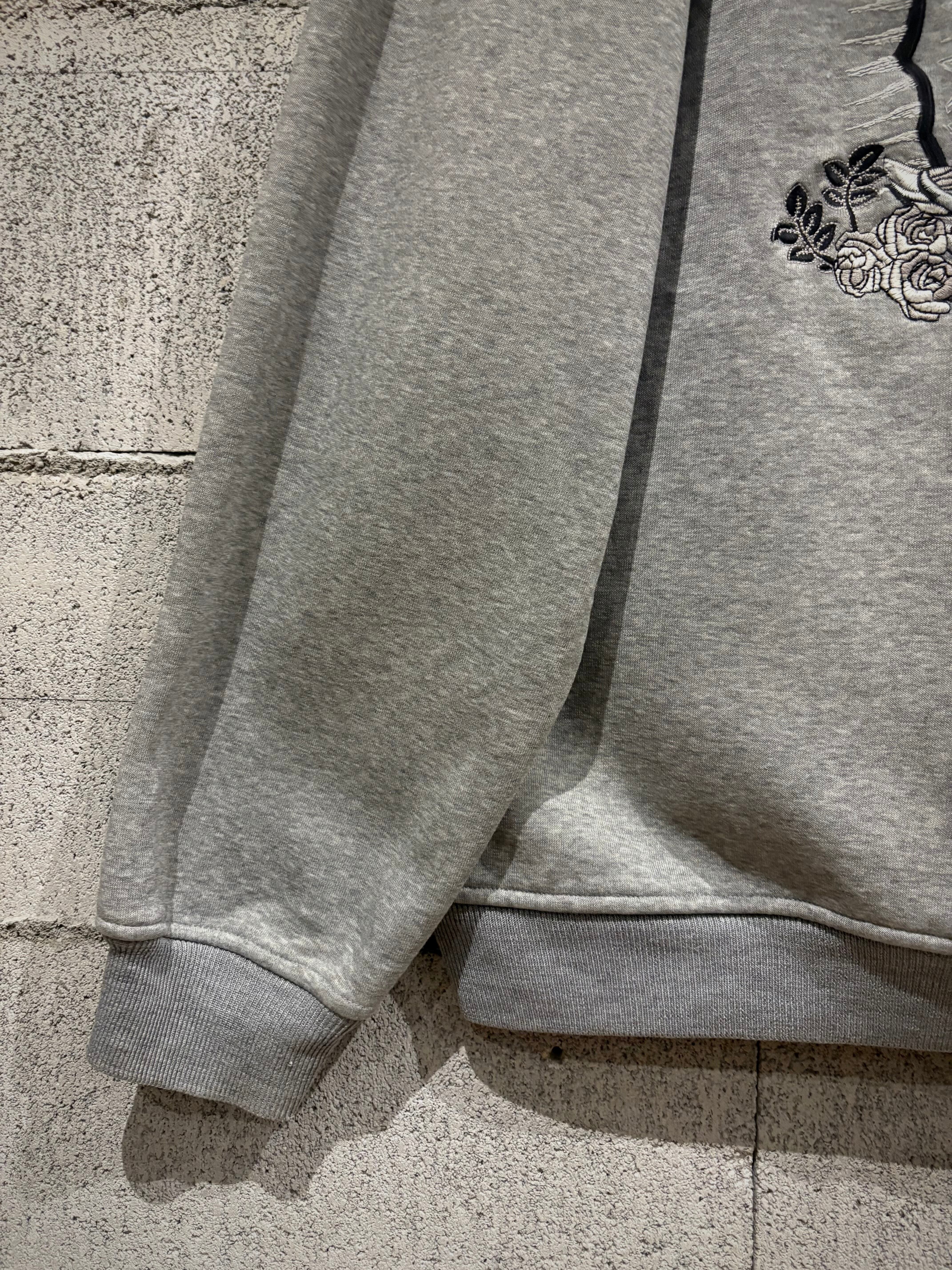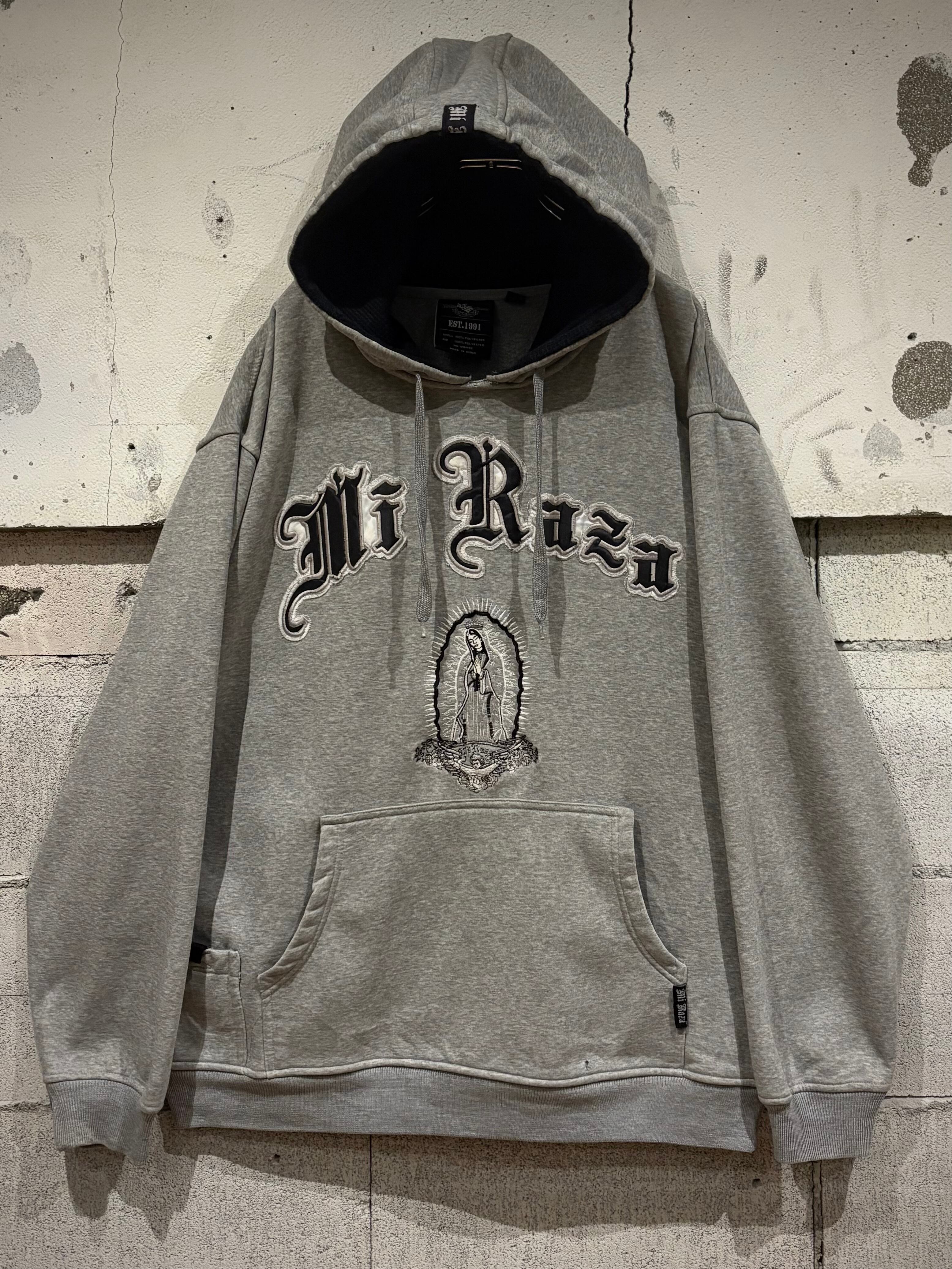 肉感のあるグレーのボディに、神聖なモチーフとして知られつつ、ストリートなデザインにも起用されるマリアを刺繍で刻んだプルオーバーフーディ。