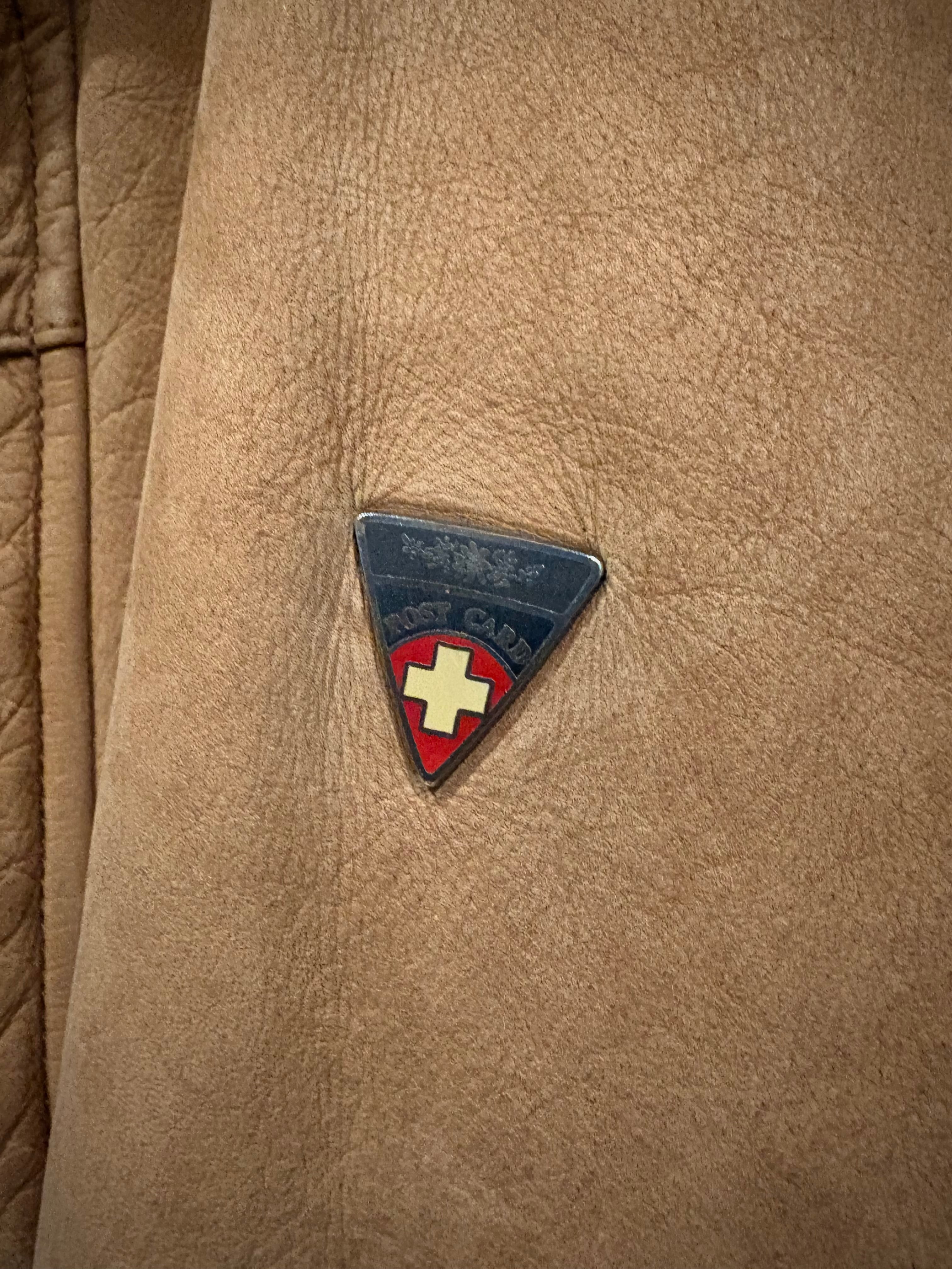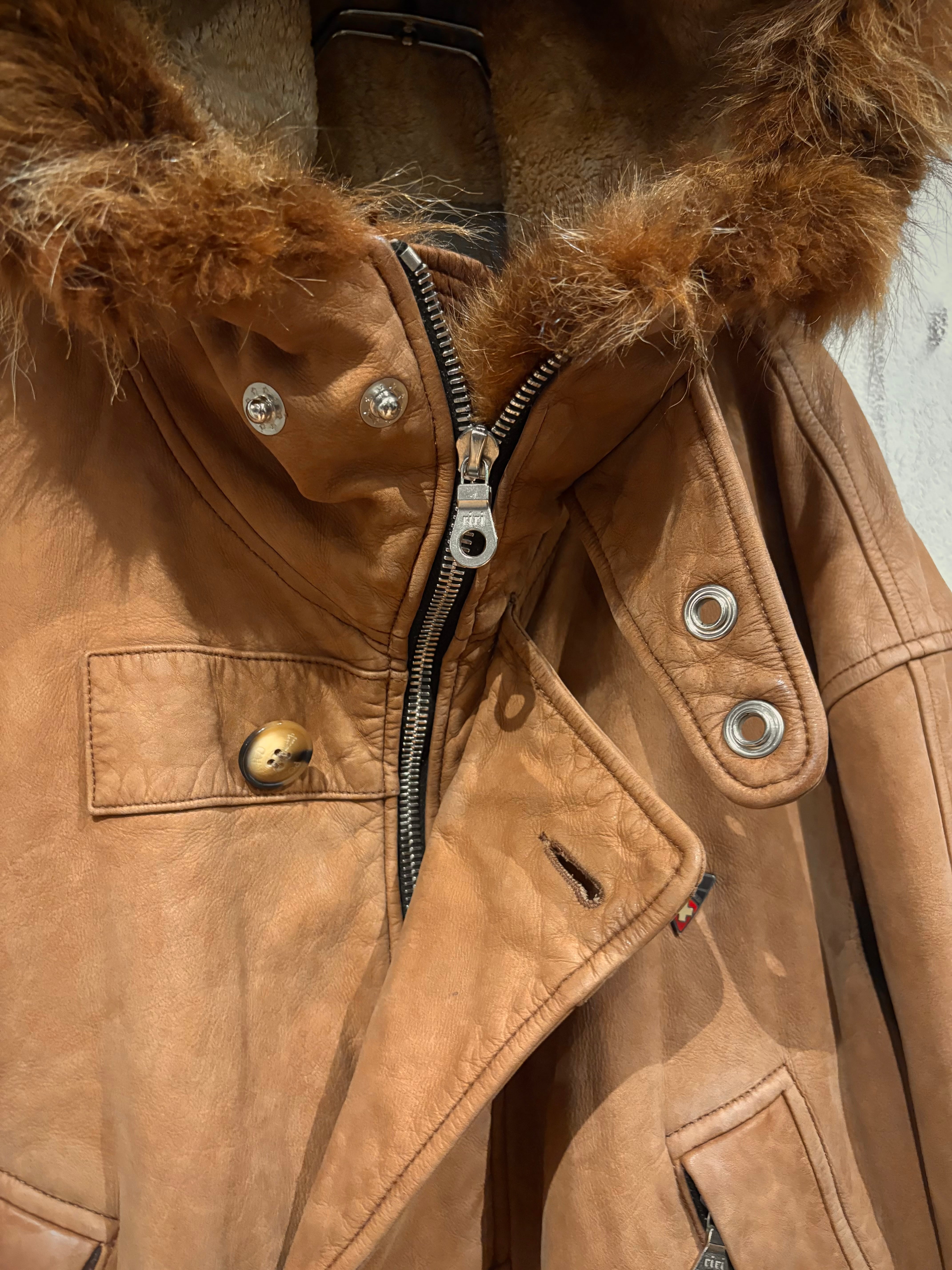 前述通り首までしっかりと隠れるチンストラップ付きのフルジップなので開けるとN-2B最大の特徴でもある、肩までかかる大ぶりなボアフードに。フードに施されたファーのクオリティも高く、肘付近にはアクションプリーツが施されており機動性が考慮されていたりと、レザークラフトの中でもかなり精巧な作り込みに心打たれます。