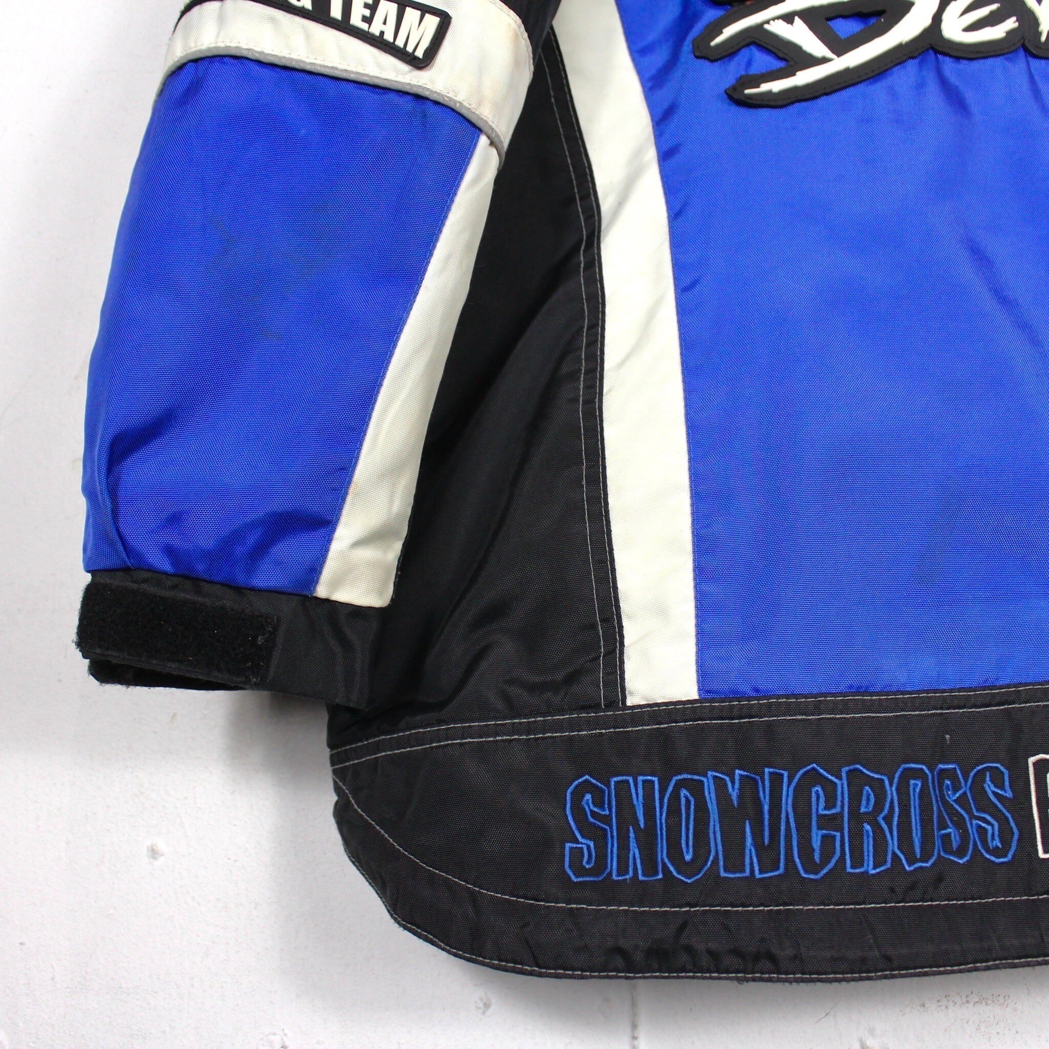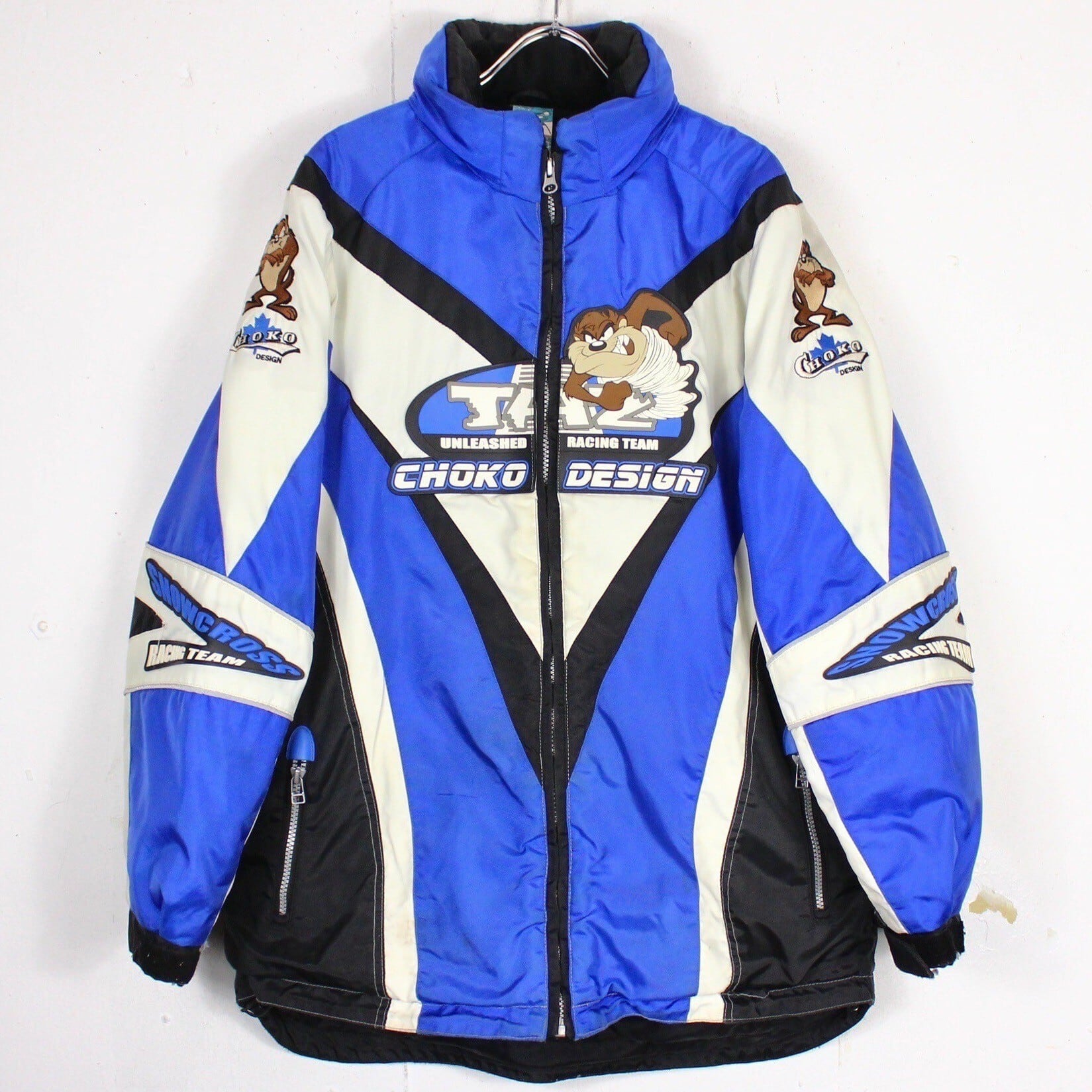 ハリのあるナイロン生地をボディに採用。ブルー×ブラック×ホワイトのカラーリングで切り替えを効かせ、"タズマニアンデビル"のシリコンパッチや刺繍を施したレーシングジャケット。