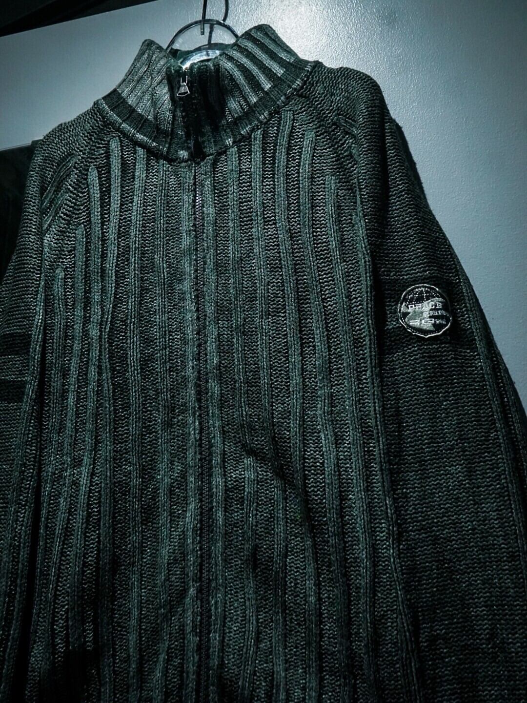 退廃的かつモードな佇まいを見せる、当店らしいドライバーズニットの逸品となっております。