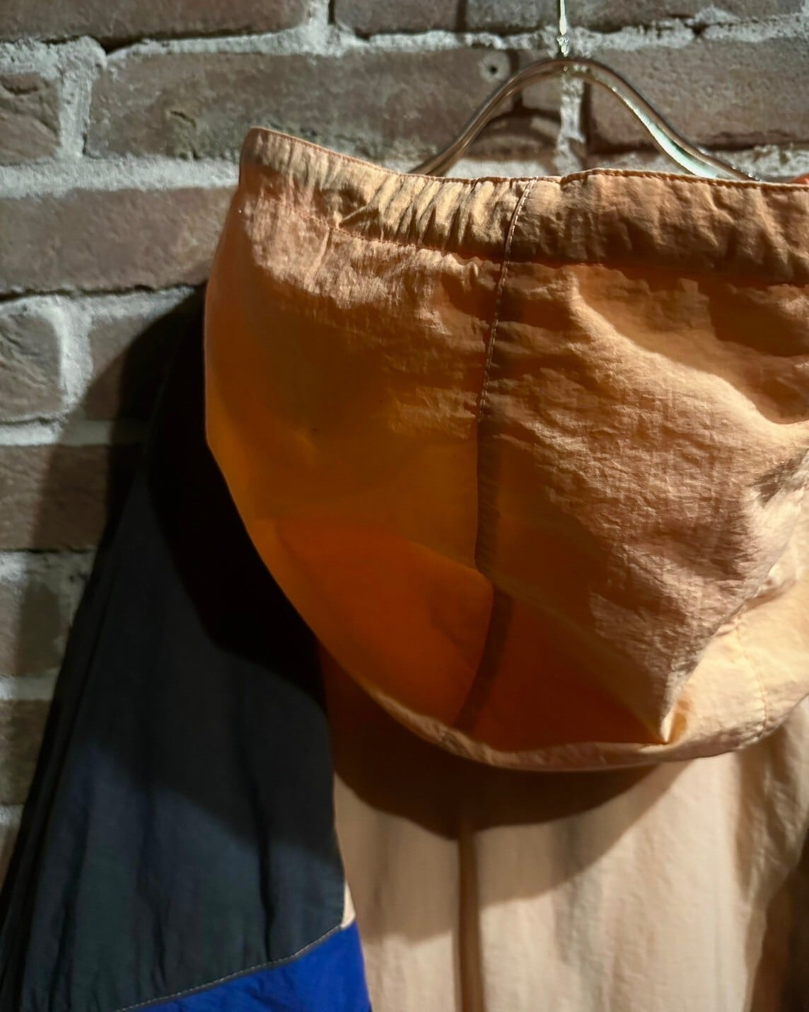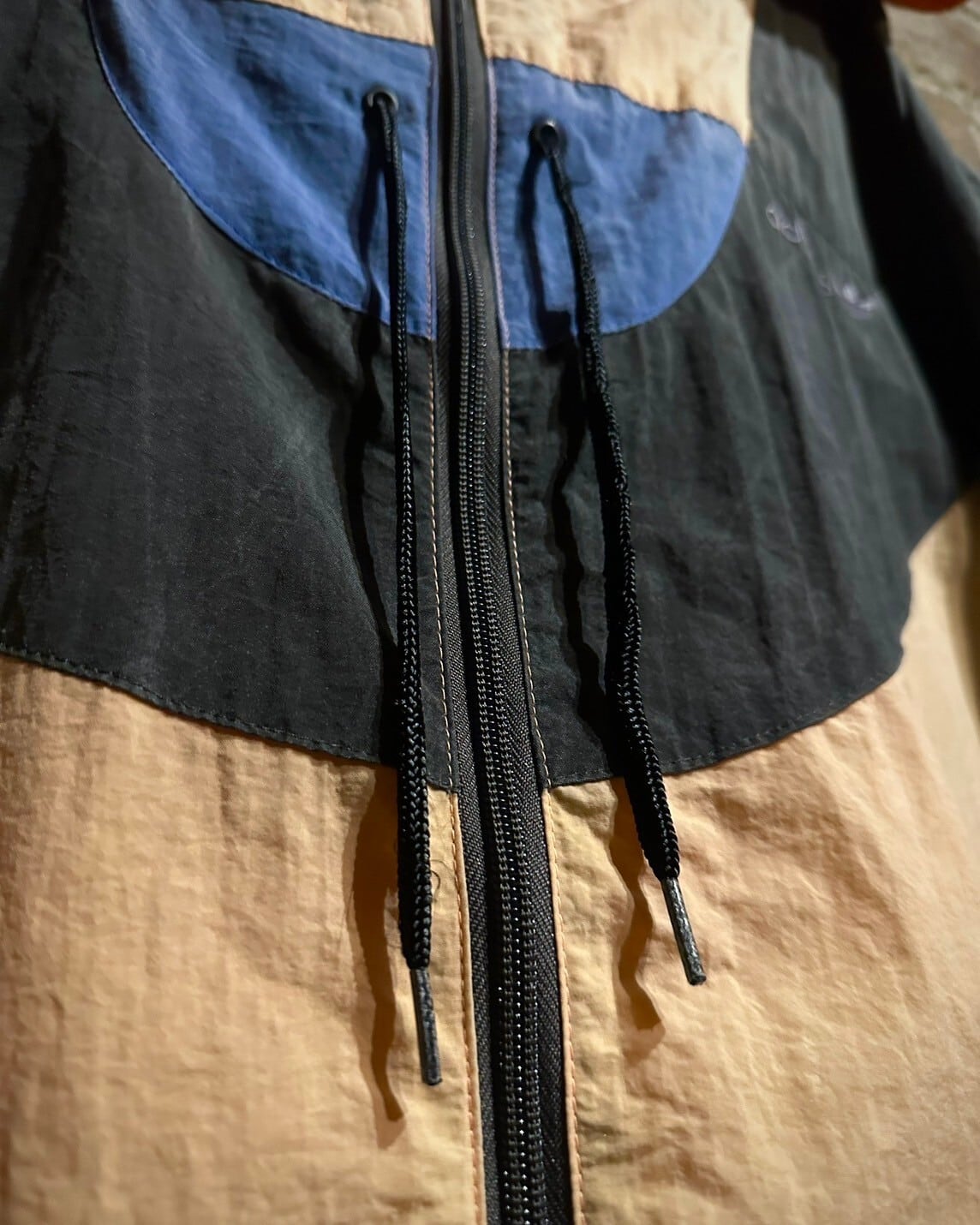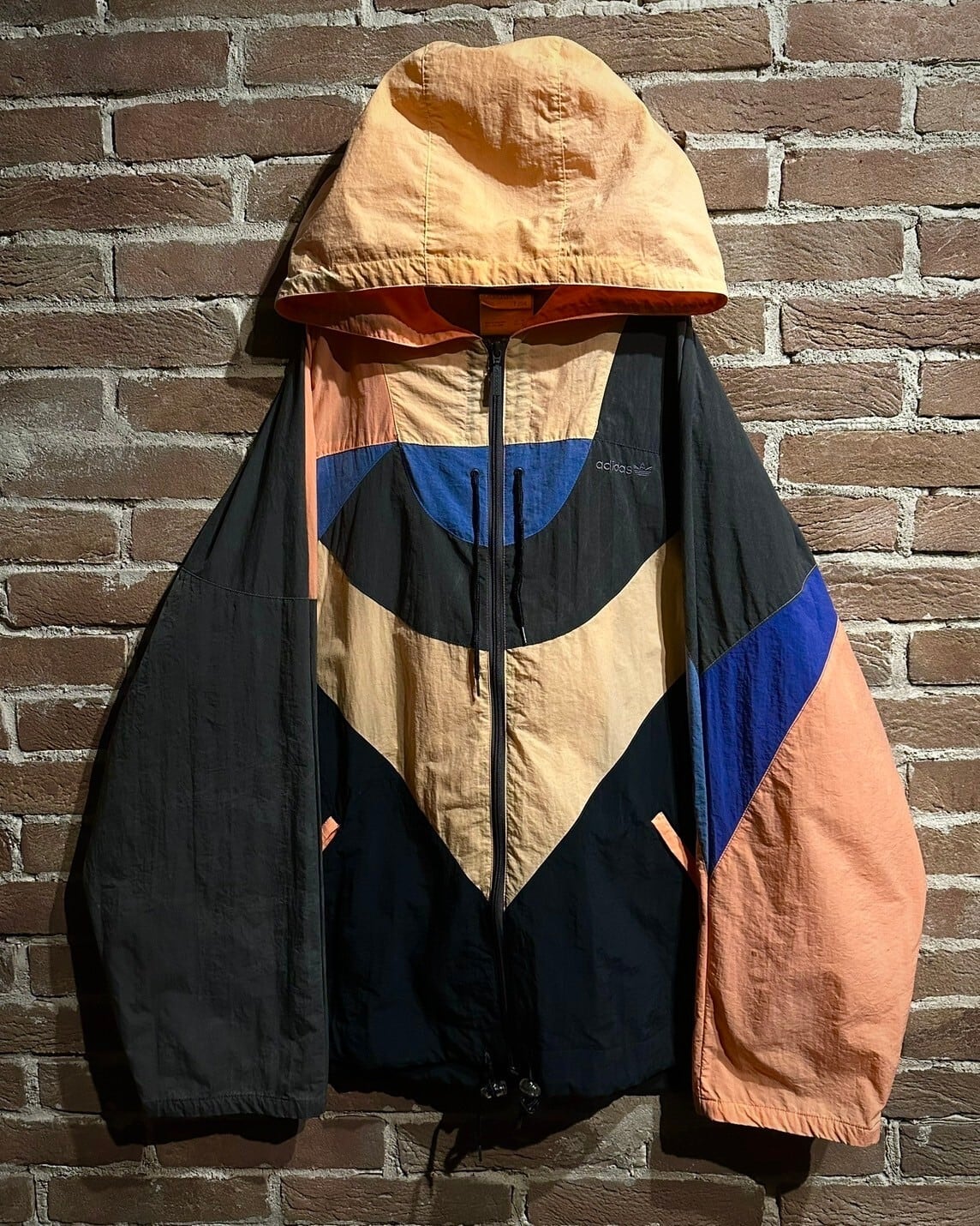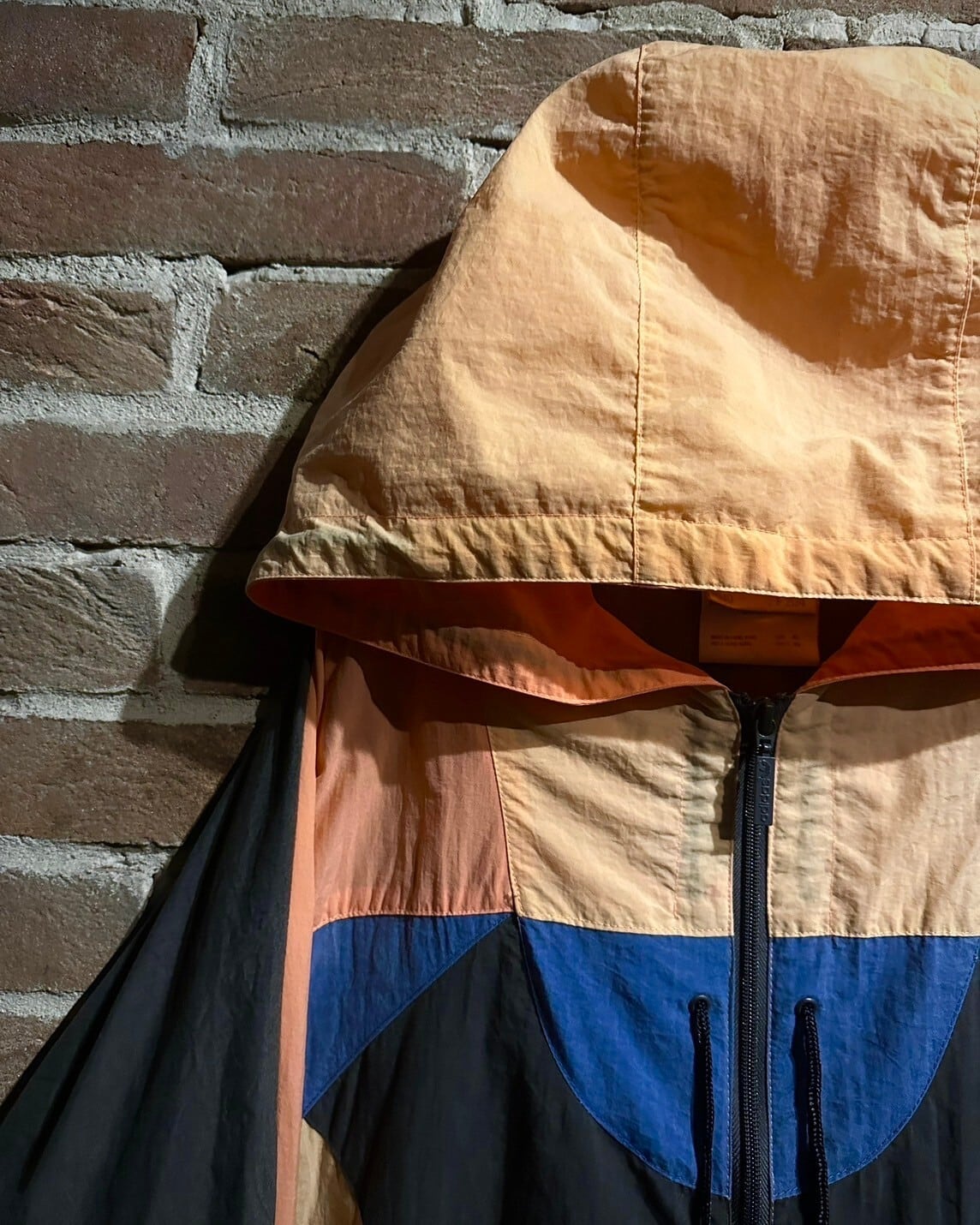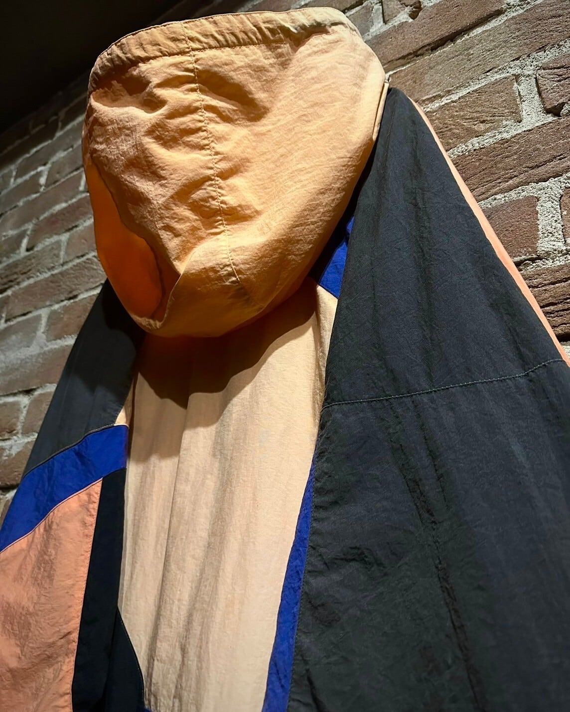 シャリ感のある素材を用いて黒、オレンジ、青のカラーリングで幾何学的かつアーティスティックに切り替えられた80'sヴィンテージのフーディジャケット。