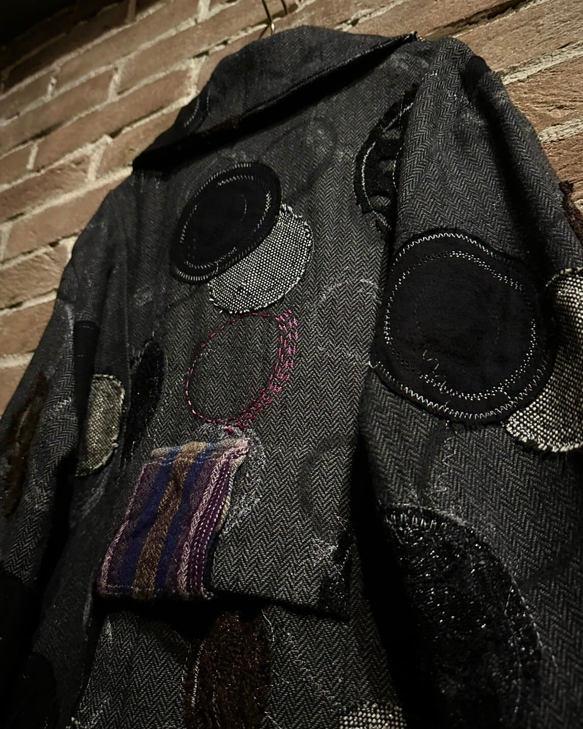 モノトーンのヘリンボーン織のボディに、別生地やステッチでドッド柄を載せた、当店らしいレトロな雰囲気を纏ったジャケット。