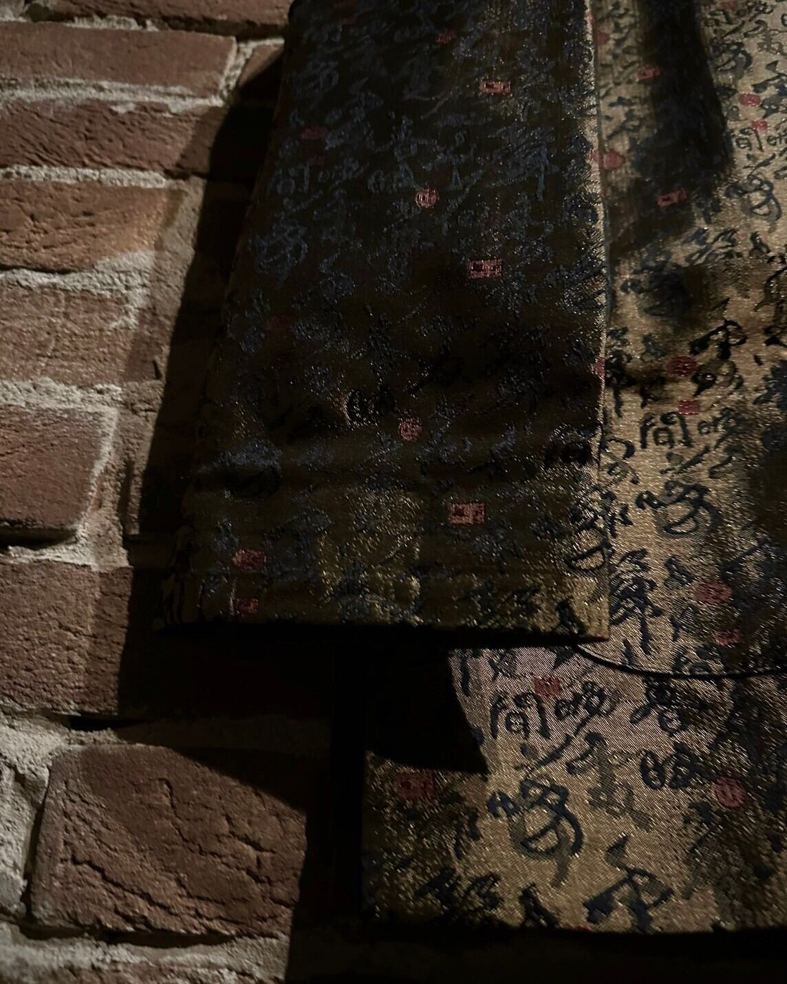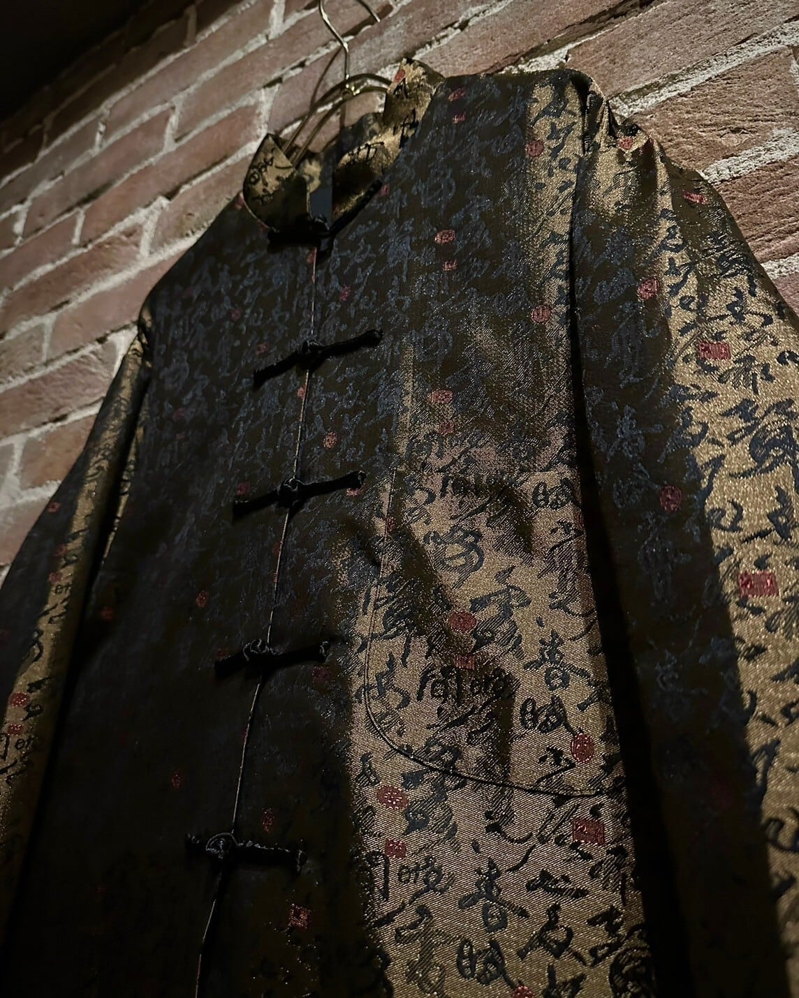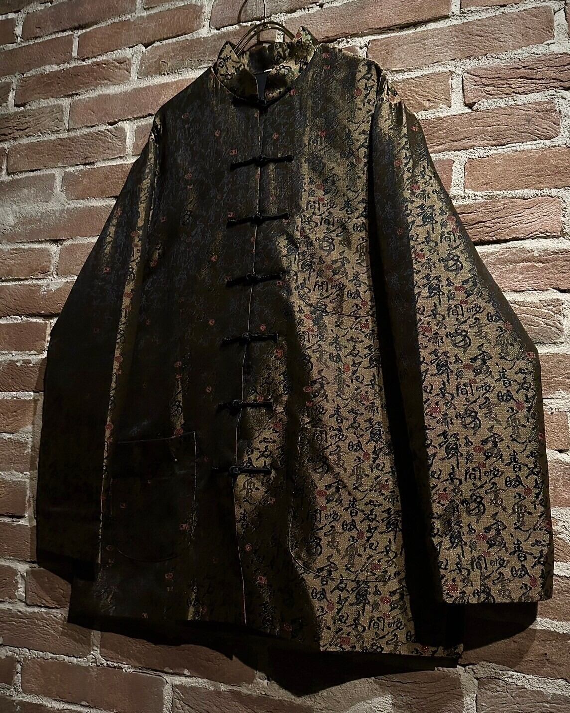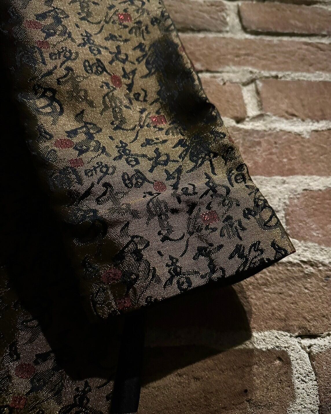 鋭い光沢を放つゴールドカラーのボディに、"漢字"をみっちりと載せたチャイナシャツ。龍や中華紋様が施されたものが多い中、漢字を載せたこの思想の強さ、服好きの心がグッと掴まれます。