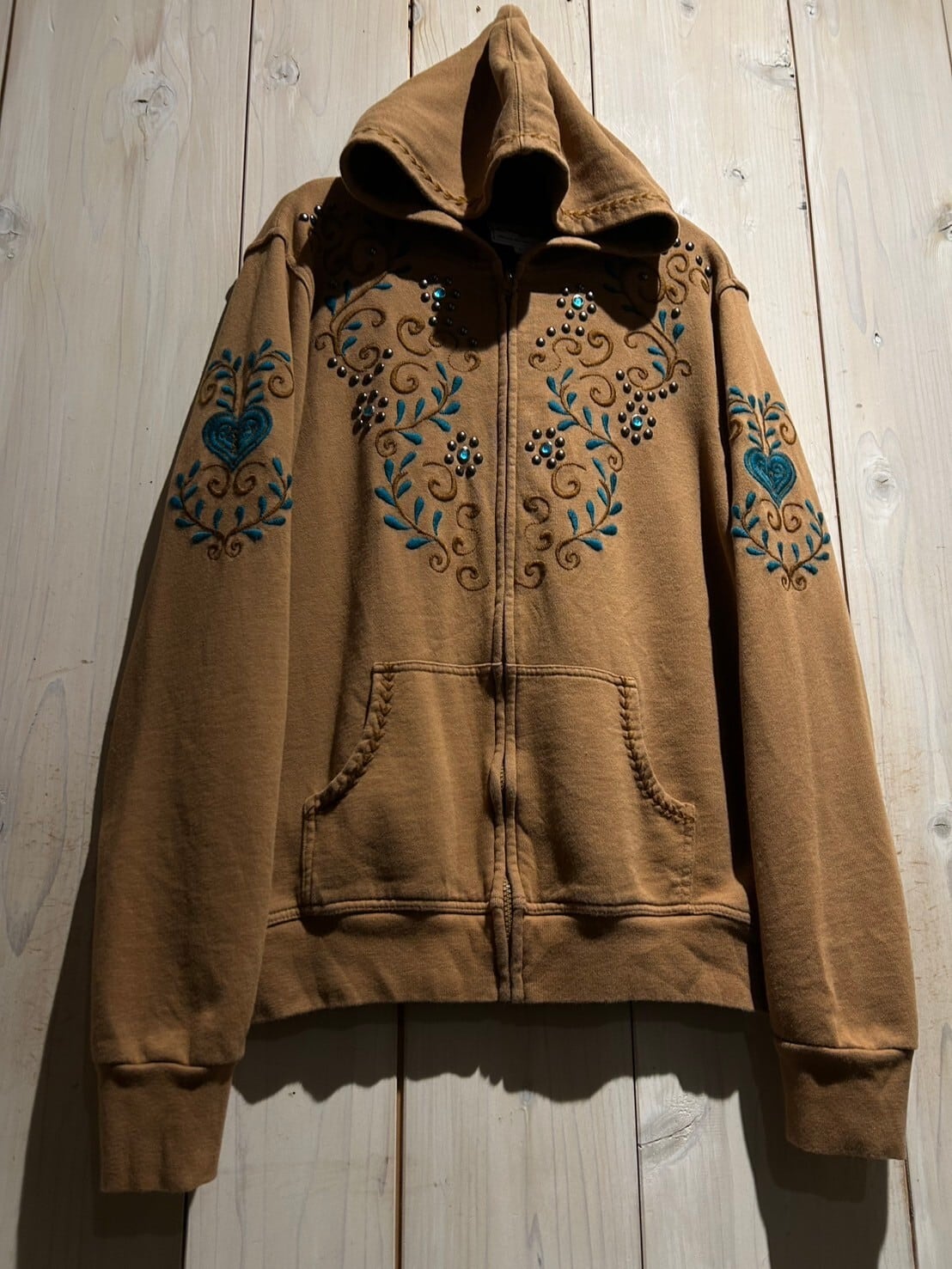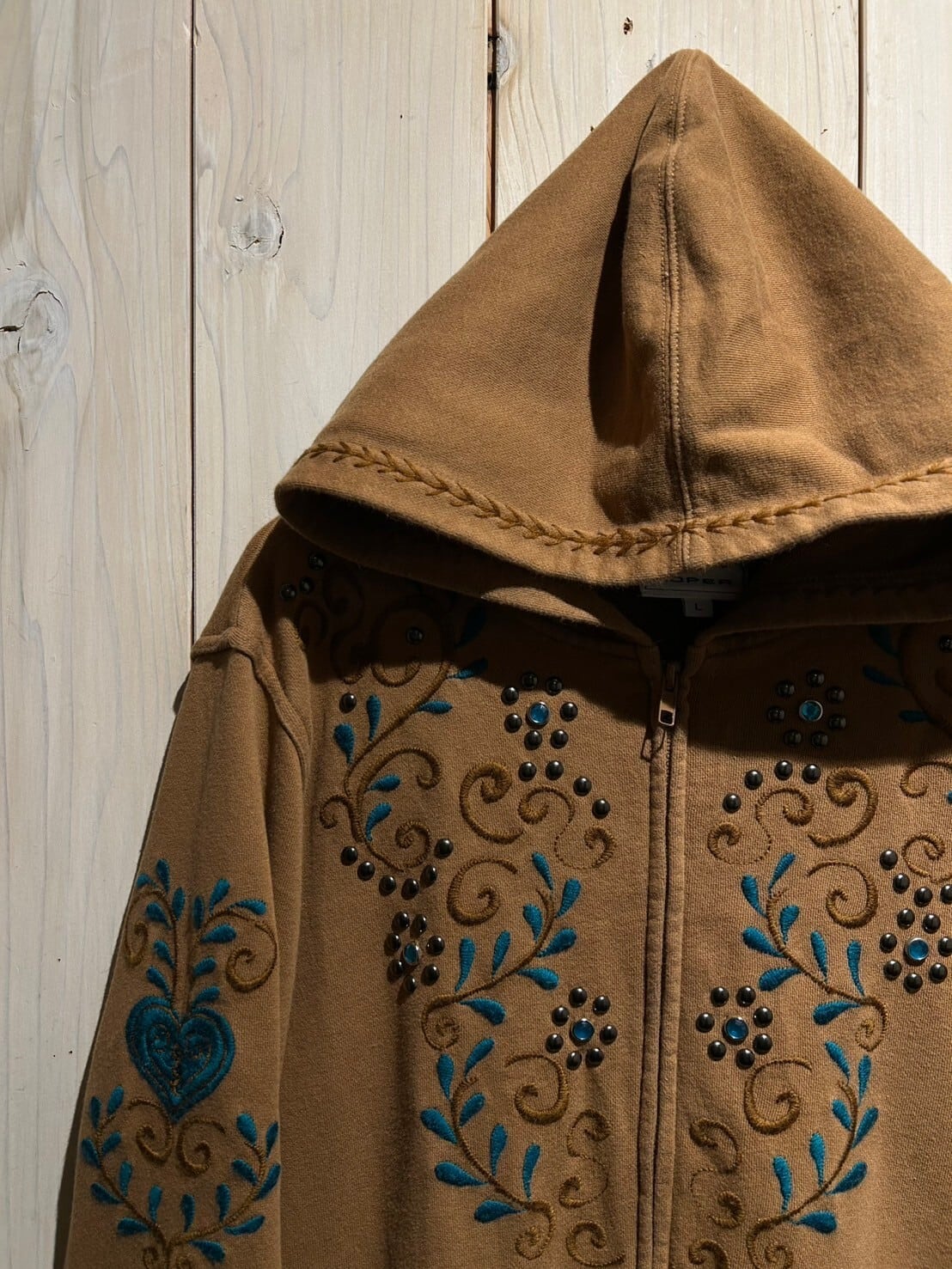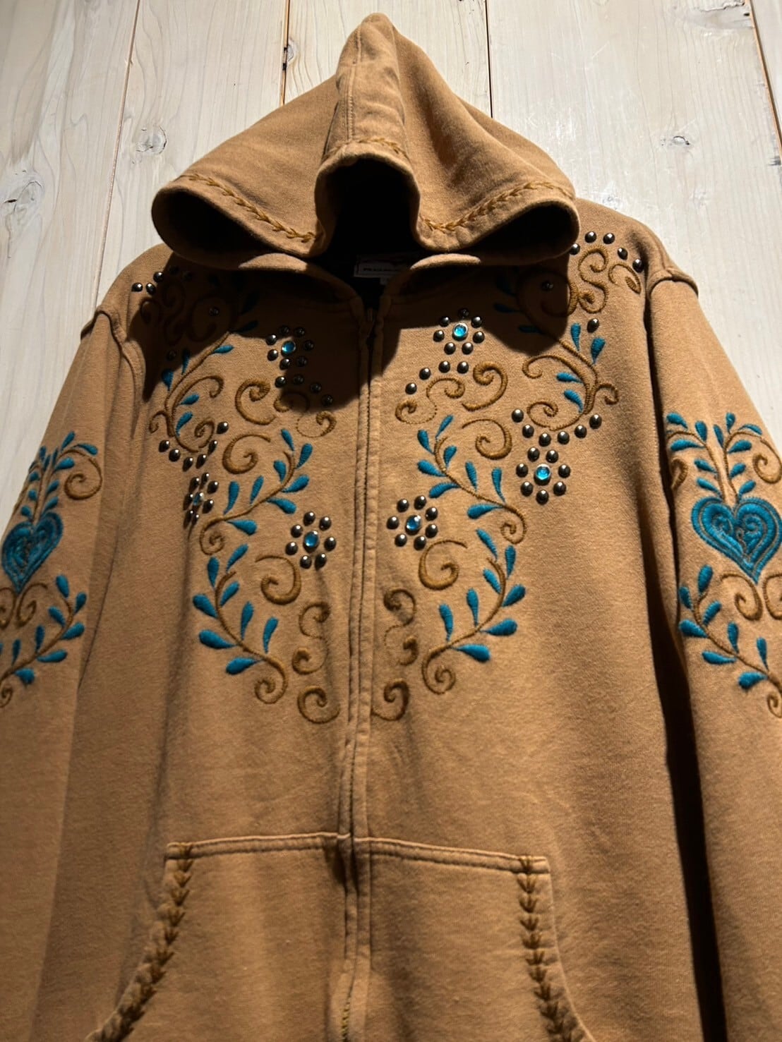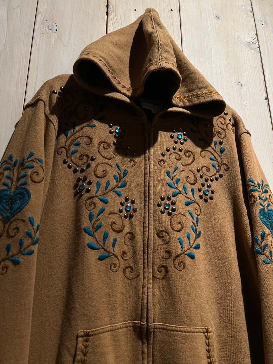 くすみのかかったベージュのボディをベースとし鮮やかなブルーやベージュで草木を表現、随所にスタッズやビジューを施したフーディー。