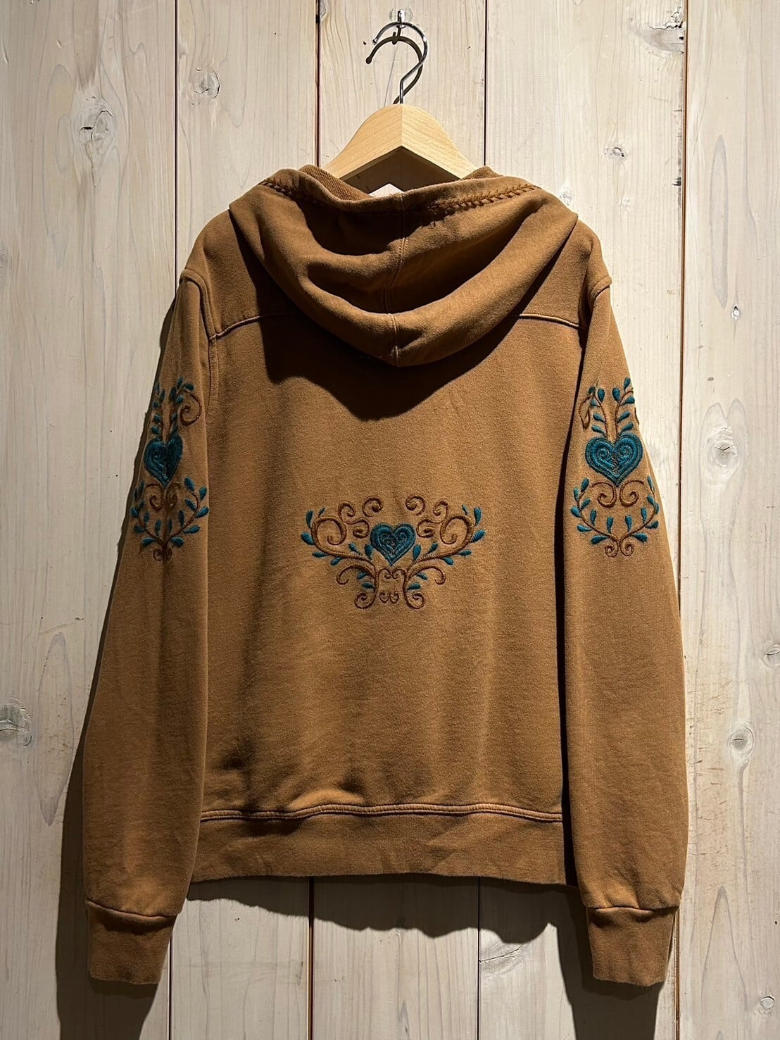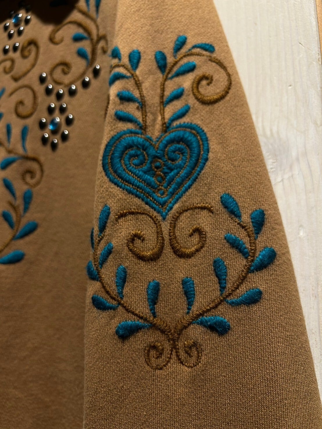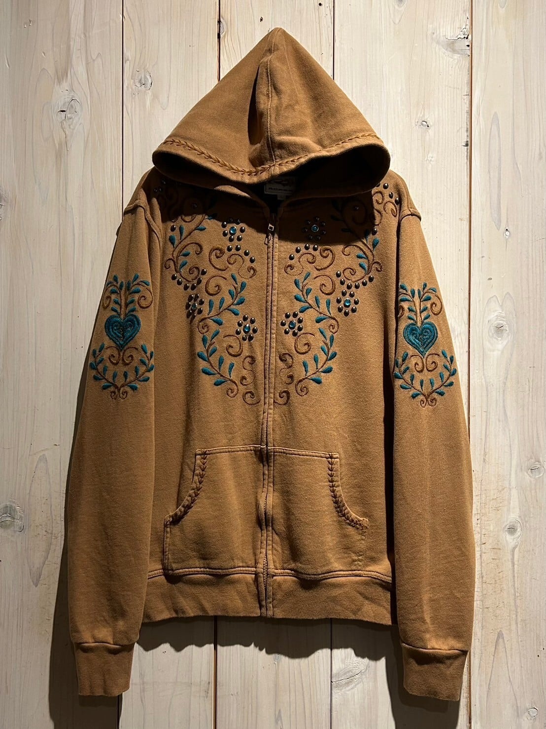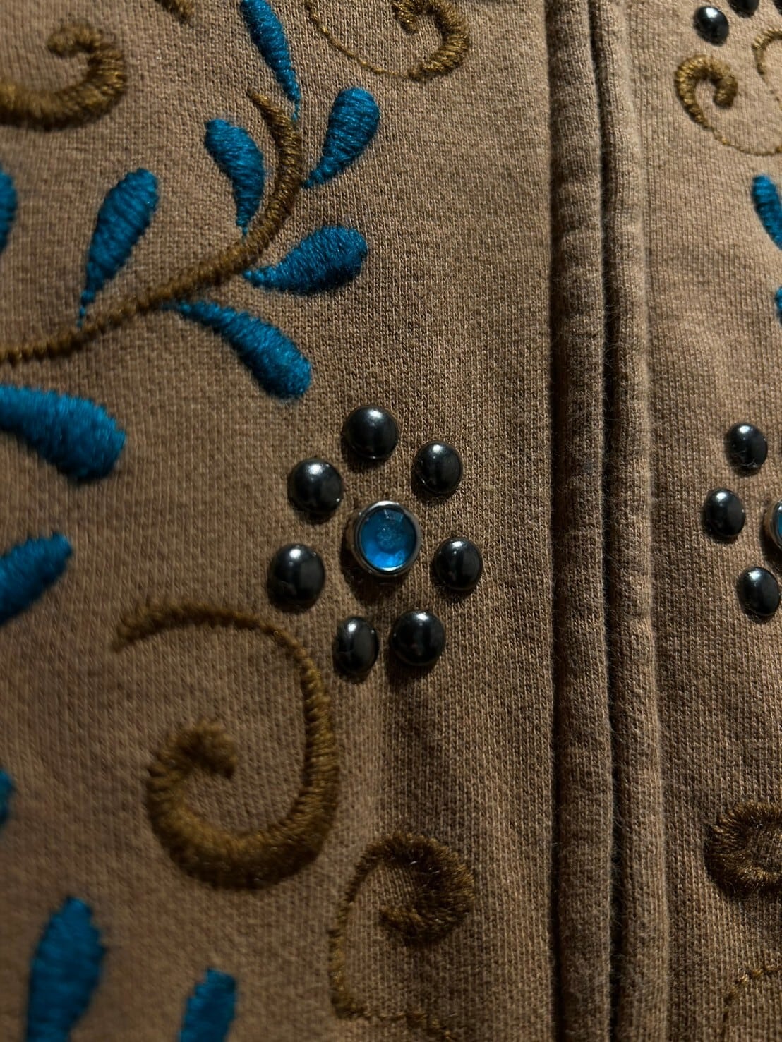 くすみのかかったベージュのボディをベースとし鮮やかなブルーやベージュで草木を表現、随所にスタッズやビジューを施したフーディー。