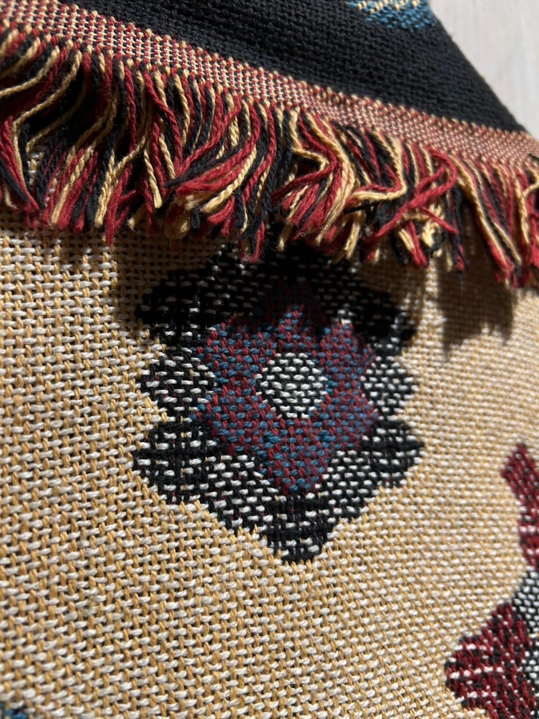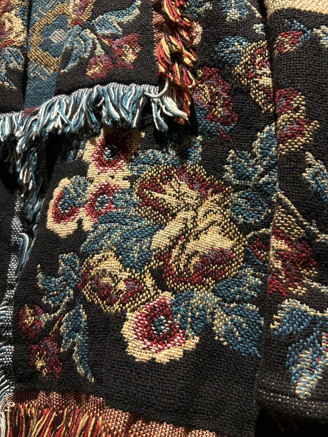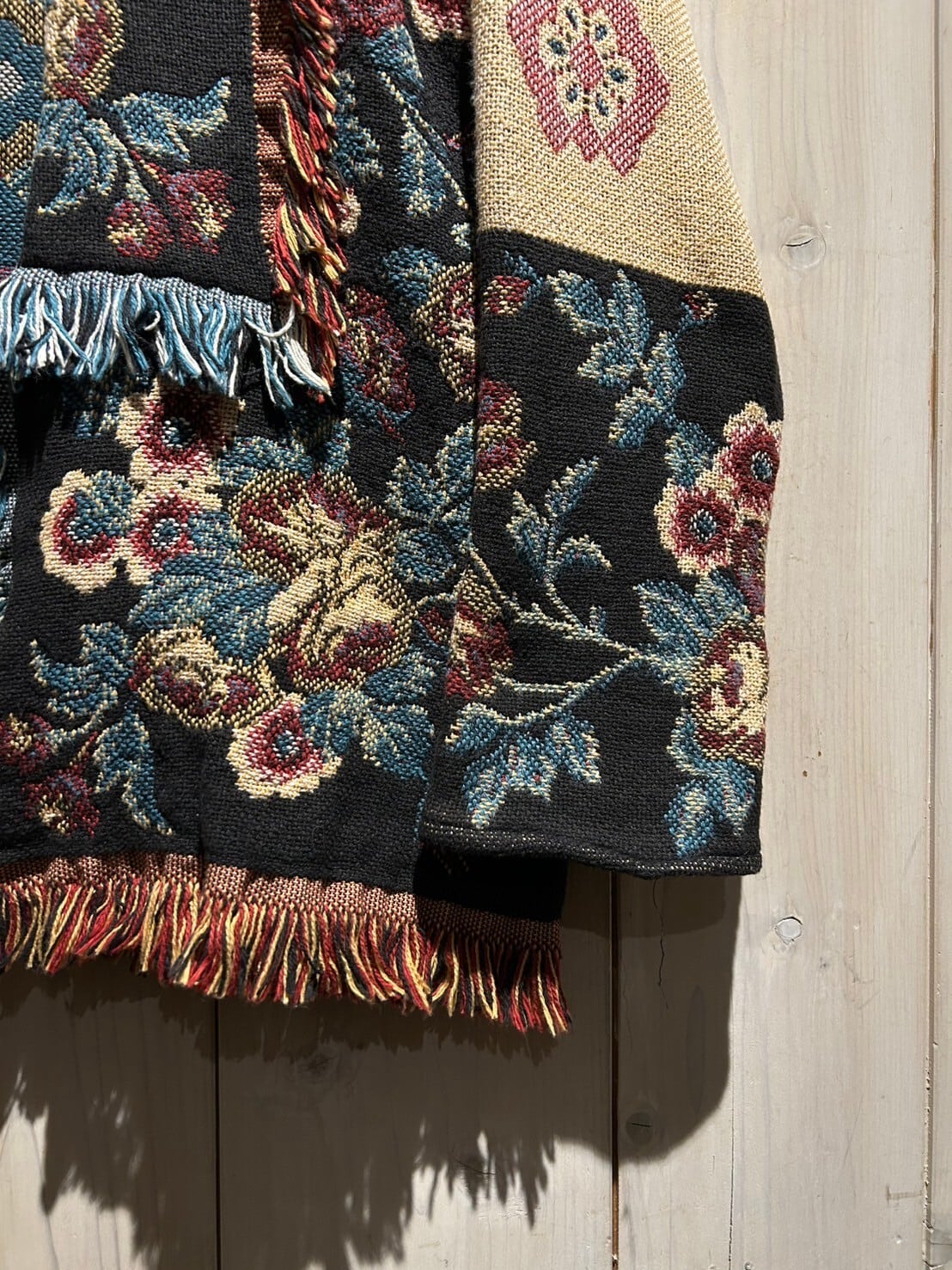 レトロかつラグジュアリーな美しい花柄にフリンジがアクセント。柔らかなゴブラン織りで肩馴染みも良く、カーディガンライクに楽〜に羽織れます◎