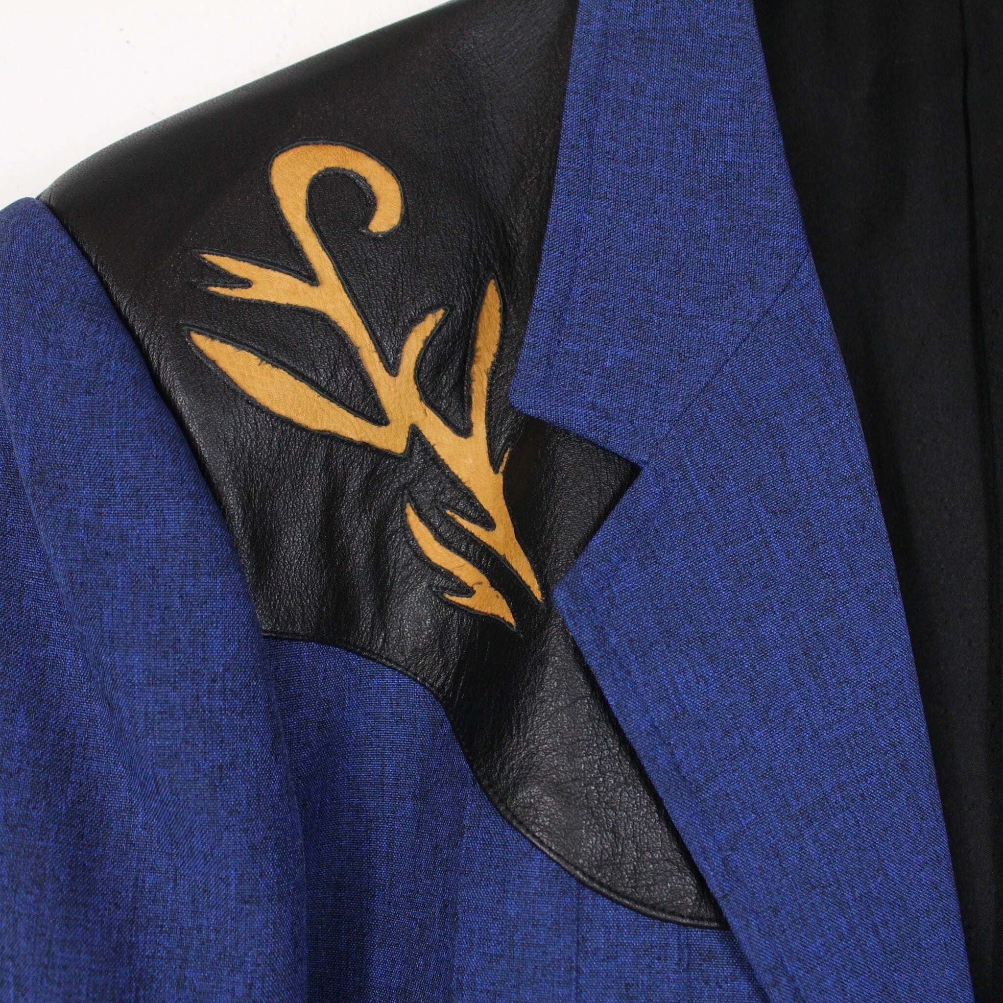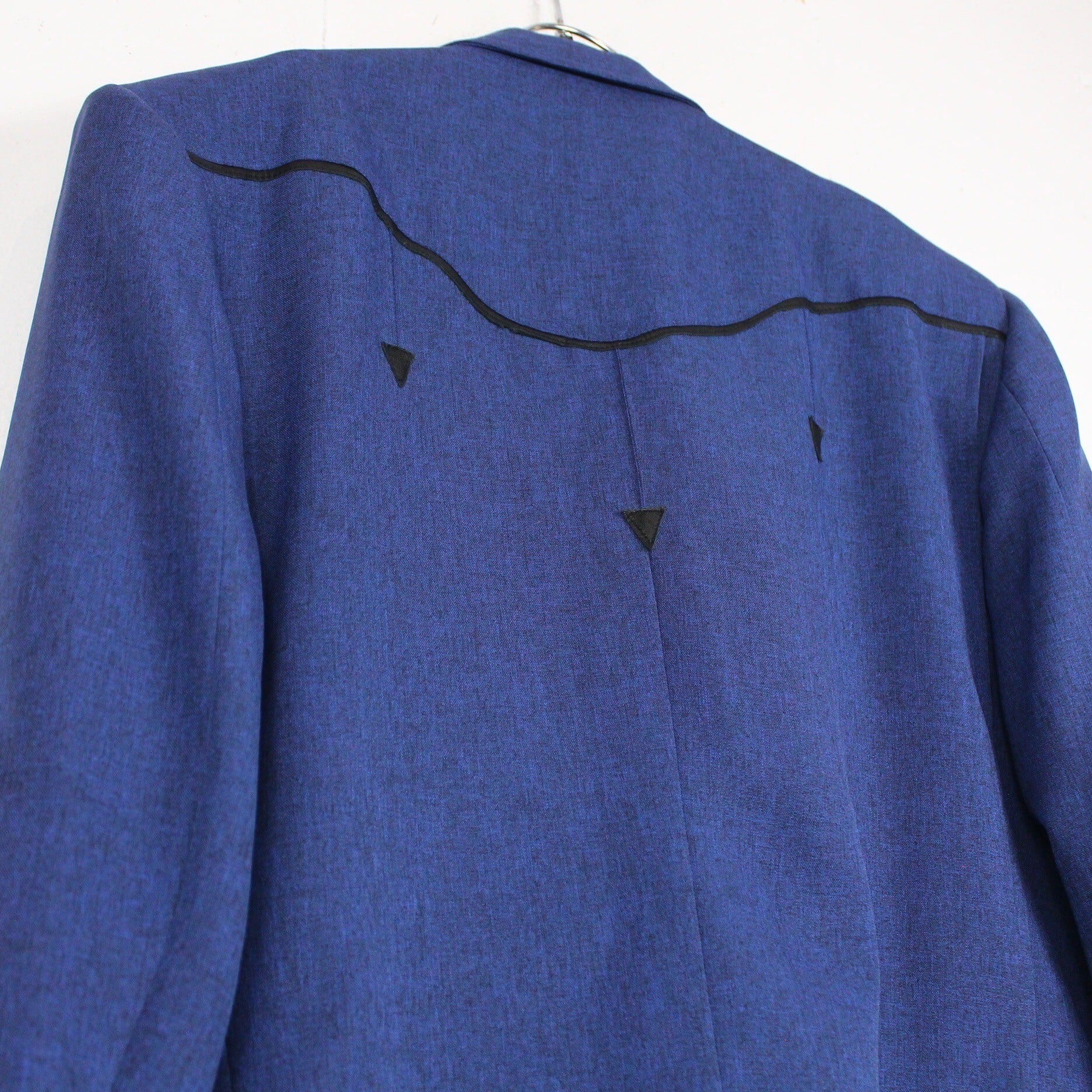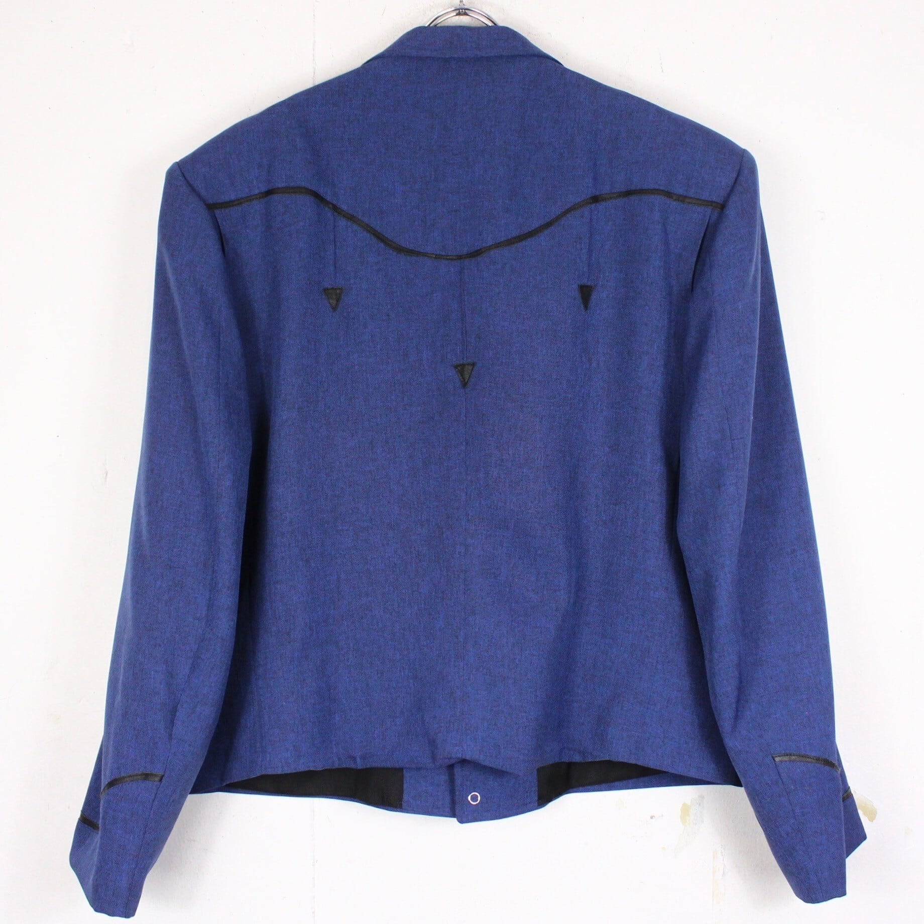 稀有なブルーカラー、ウエスタン仕様の短丈テーラードジャケットに、ヨーク部分をフェイクレザーで切り替えを施した70'sヴィンテージの1着。